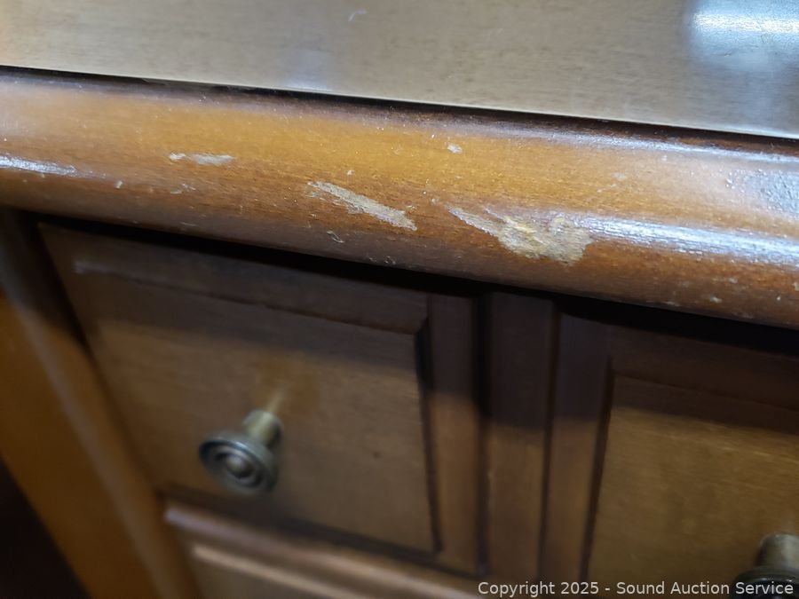 Some scuffs, wear to finish, laminate top. Approx. 22" H x 23.5" W x 23.5" D.