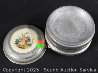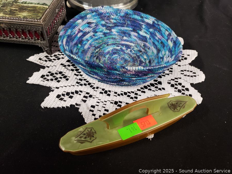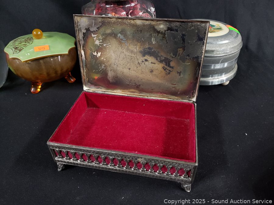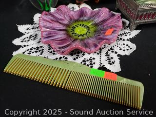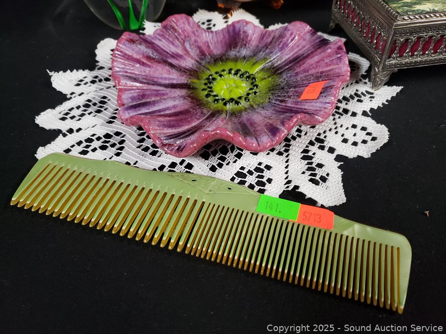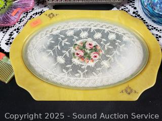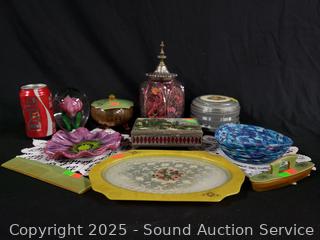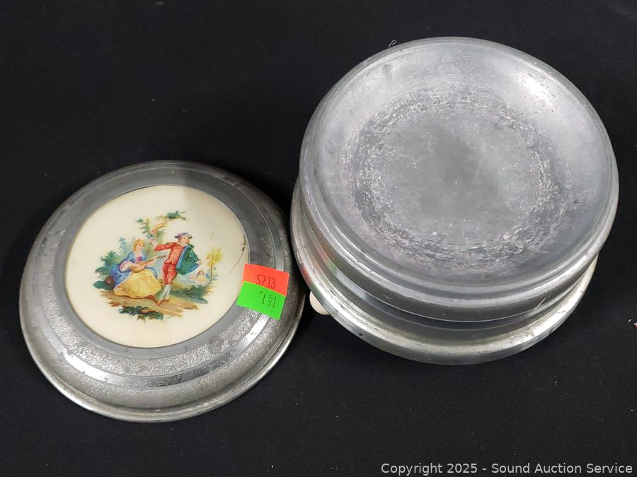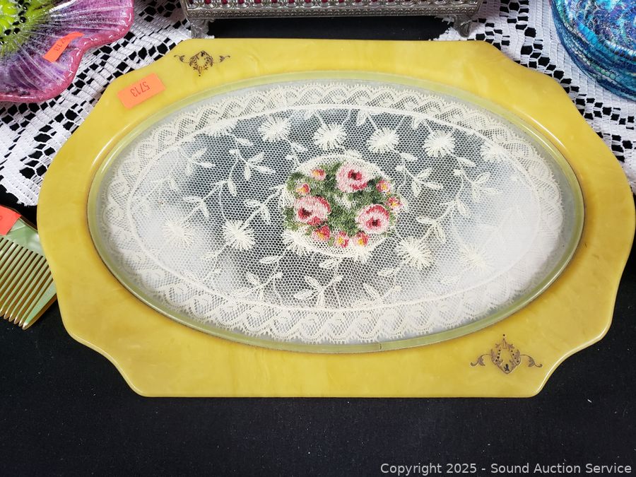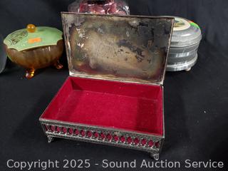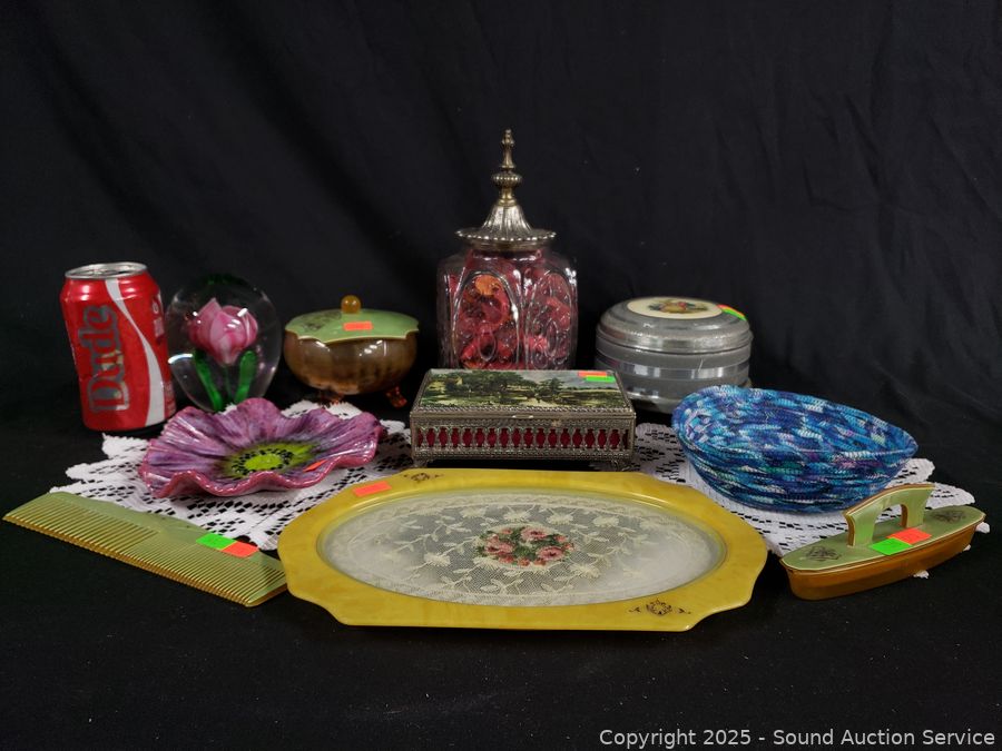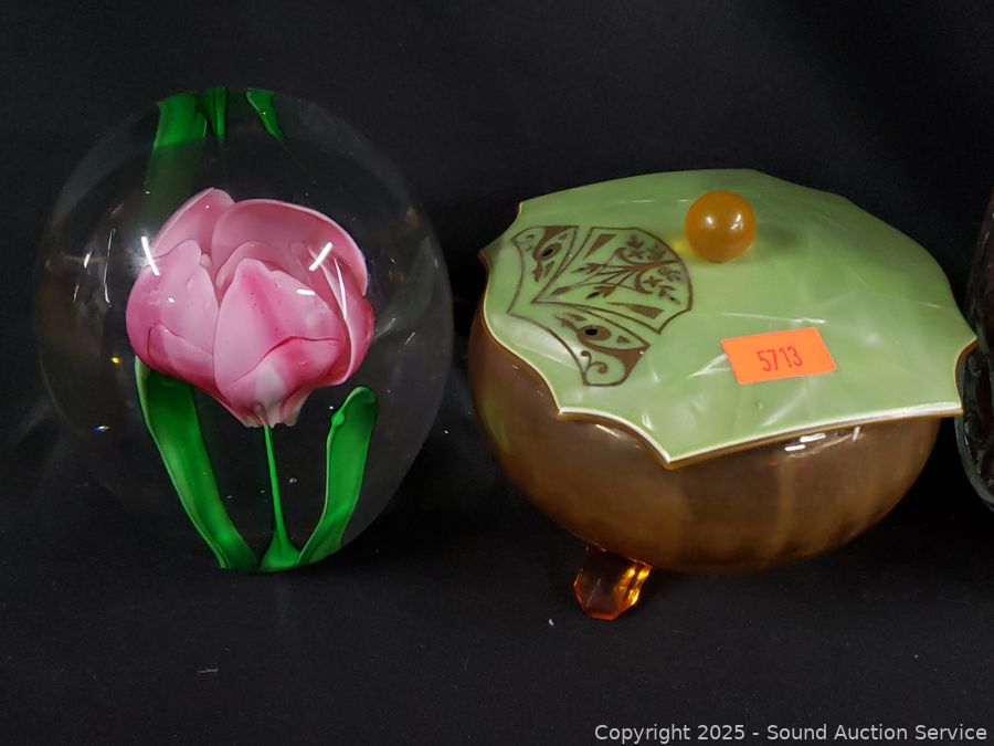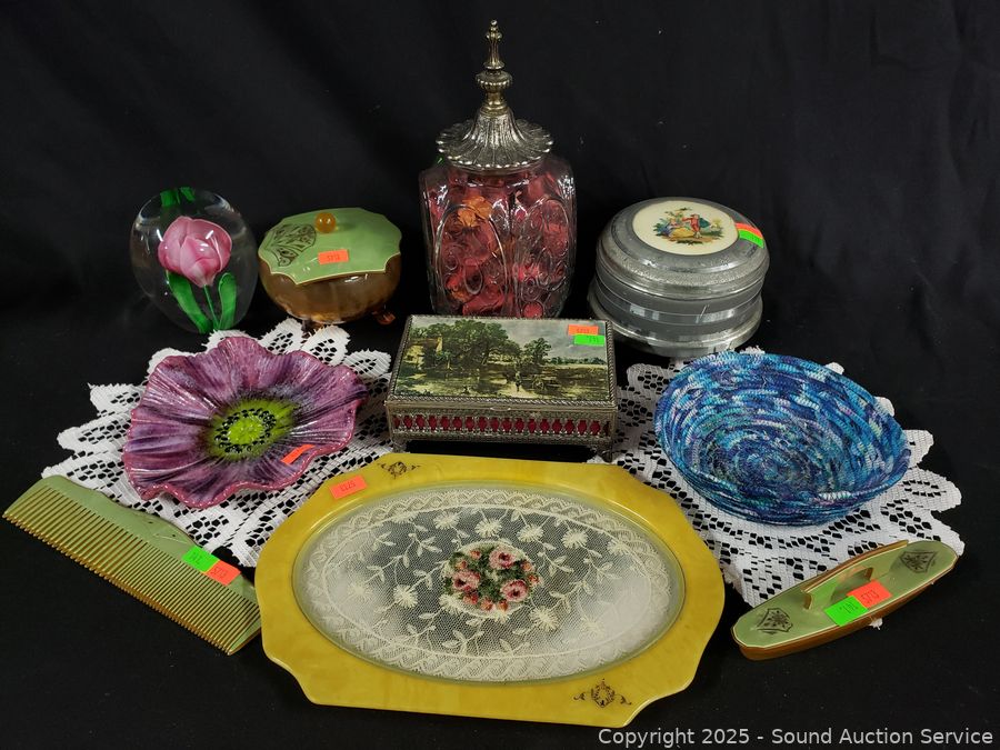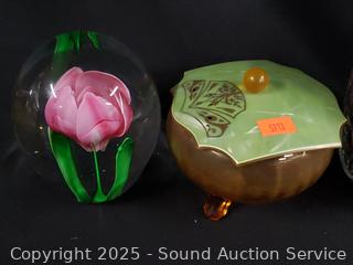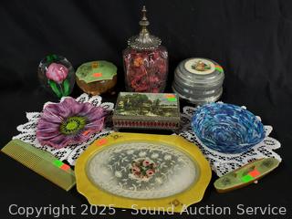 Lot #0141: Pyralin Vanity Set, Powder Dish, Trinket Box, Glass Paperweight
