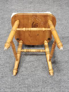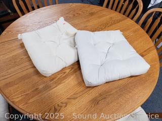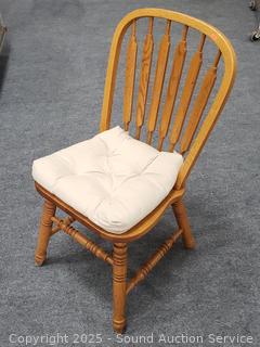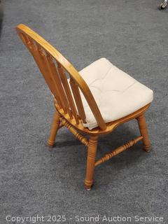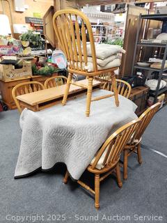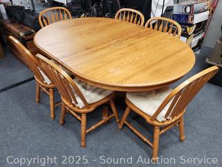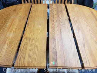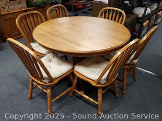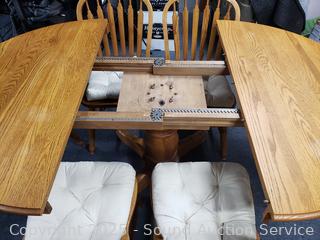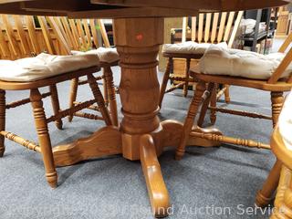 In great condition. 6 slat back turned wood chairs, come with chair pads. 31" H x 47" Dia. with (2) 11" leaves.