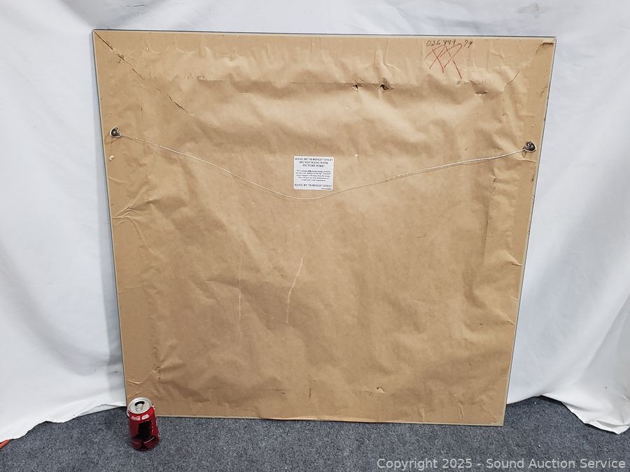 38" x 38". Don't see any major issues. Framed, matted with glass.