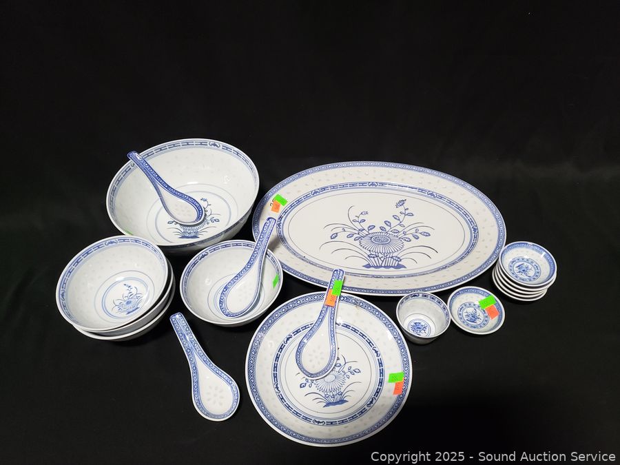 4 raman spoons, 8" bowl, 13" platter, (4) 5" bowl, (6) 2.75" dishes, 7" dish, etc. Refer to photos for lot contents, more details.