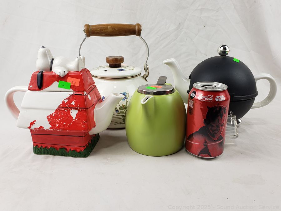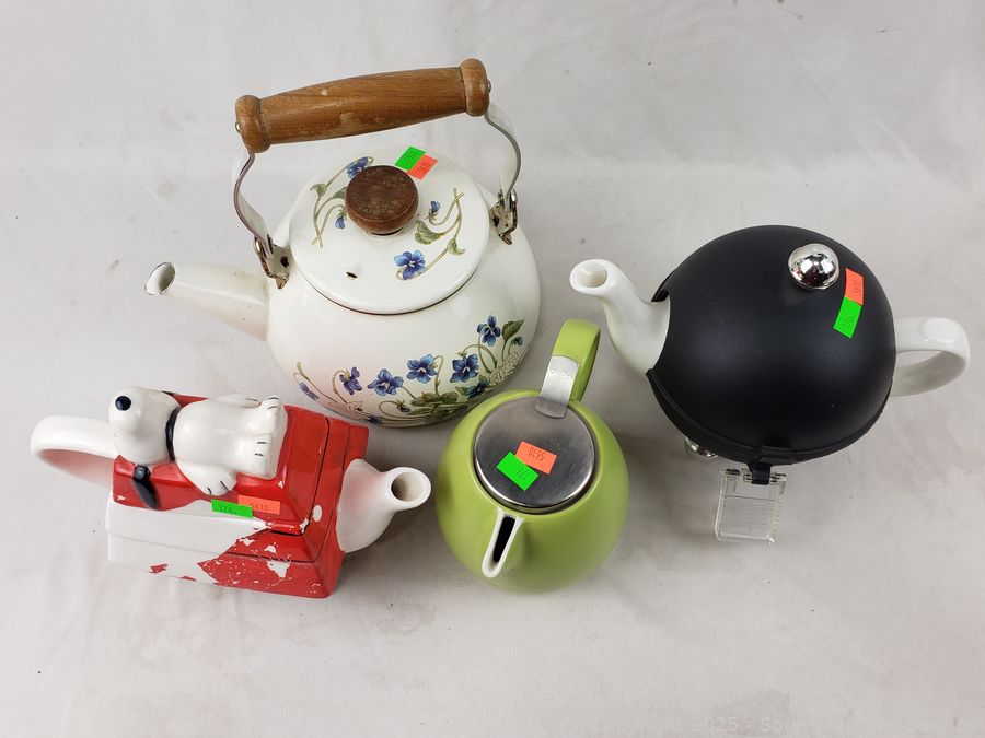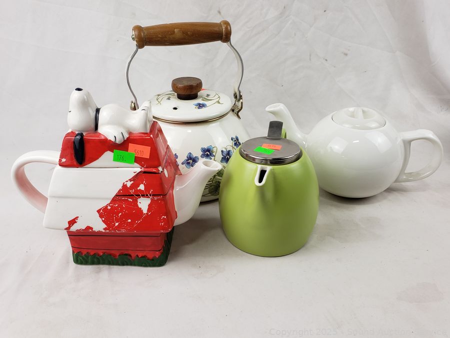 CiB Snoopy, Tea Forte creamer, teapot with cozy (unmarked), Enamelware teapot (unmarked).