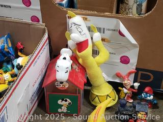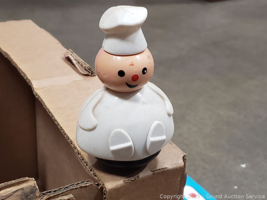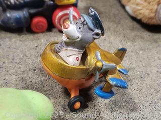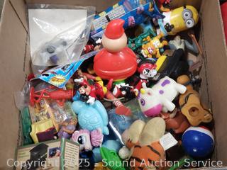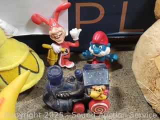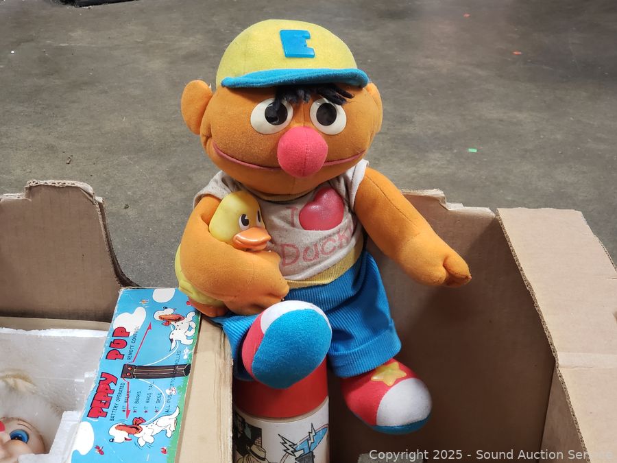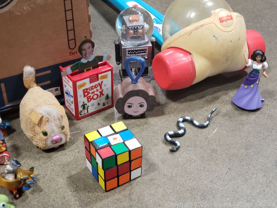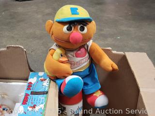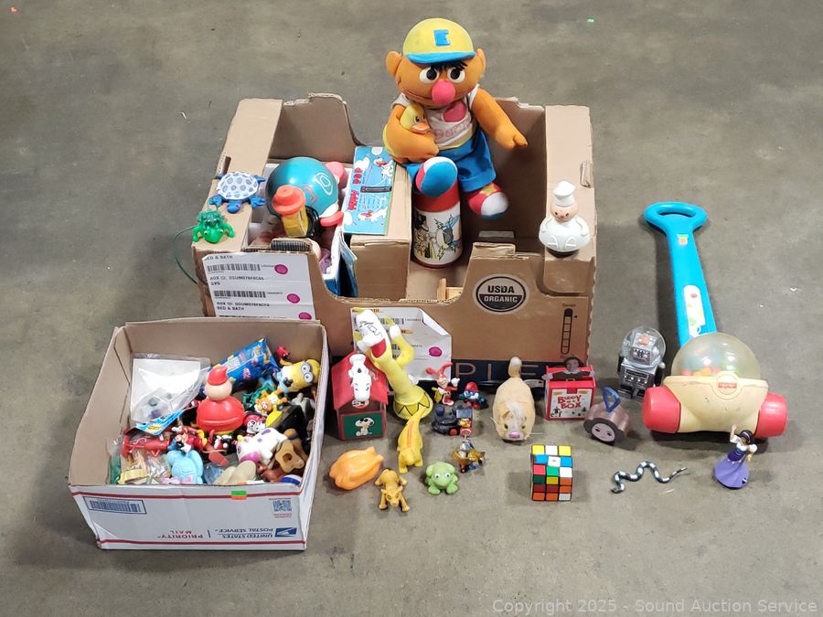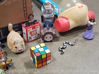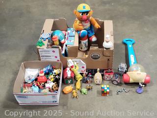 Assorted toy figures, rubix cube, pull toys, plush Ernie doll, Fisher price clock toy, etc. Refer to photos lot contents, more details.
