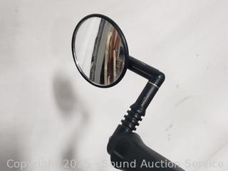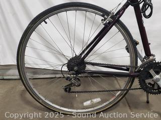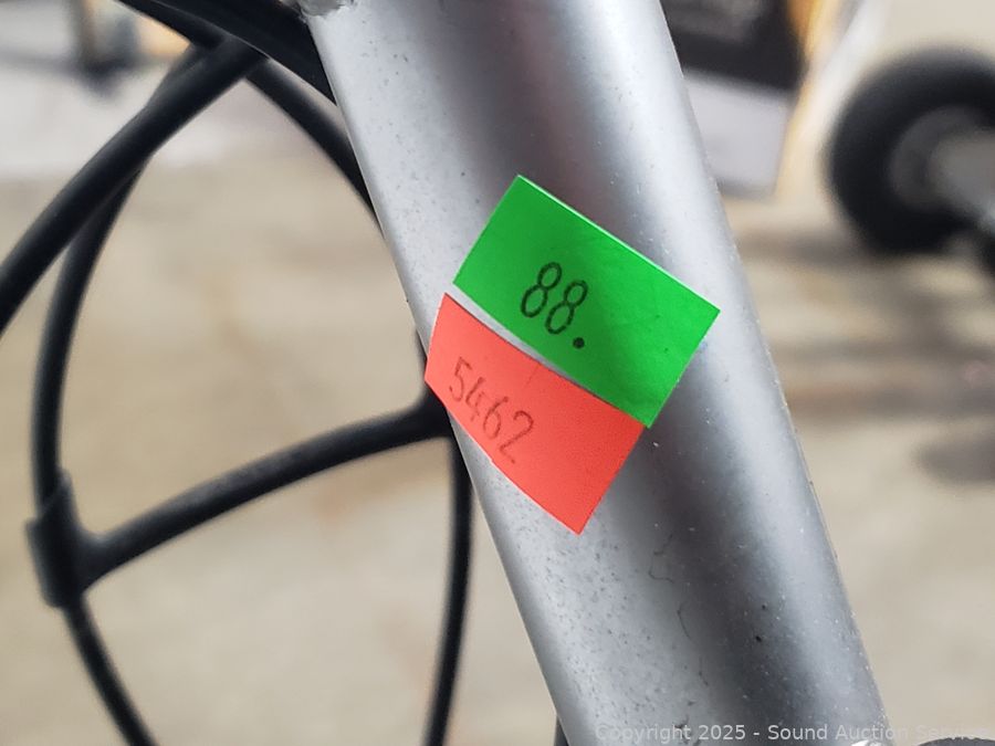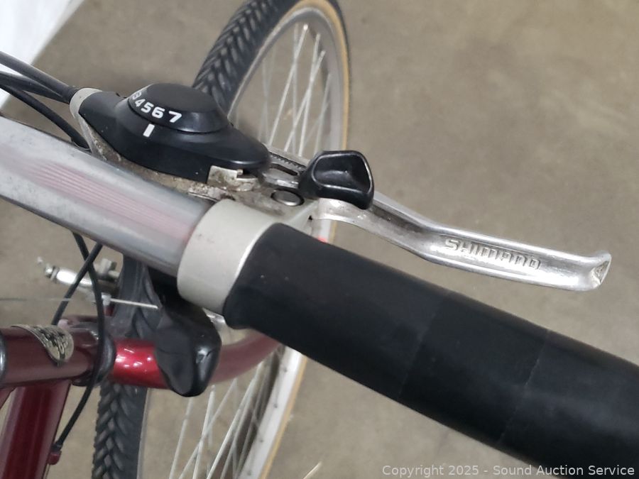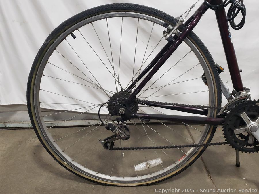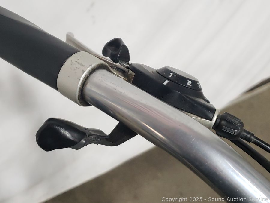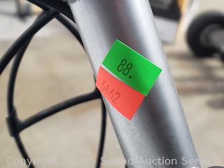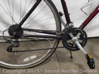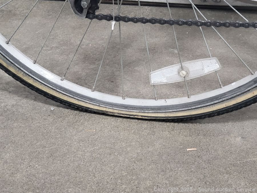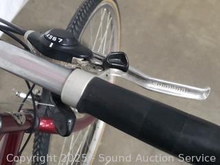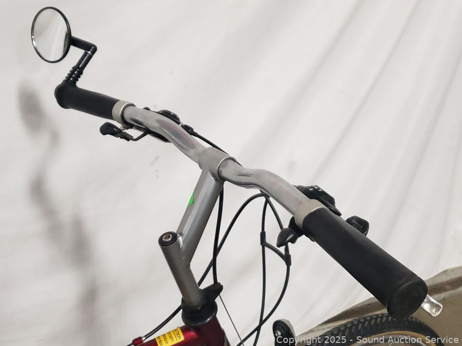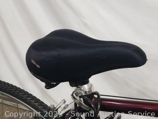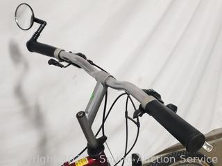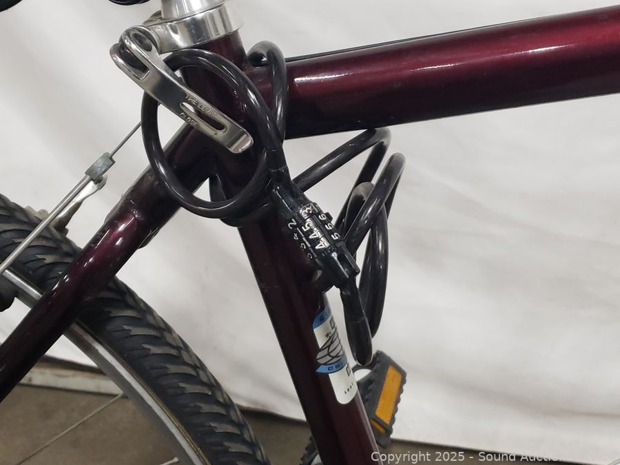 Has a locked combination cable lock mounted wrapped around frame, unsure of the combination. Cantilever brakes, finger & thumb click shift, appears to be functioning as intended. Tires are low need air, unsure if holding air. Bottle holder, rear view mirror. Signs of wear from use, overall good condition.