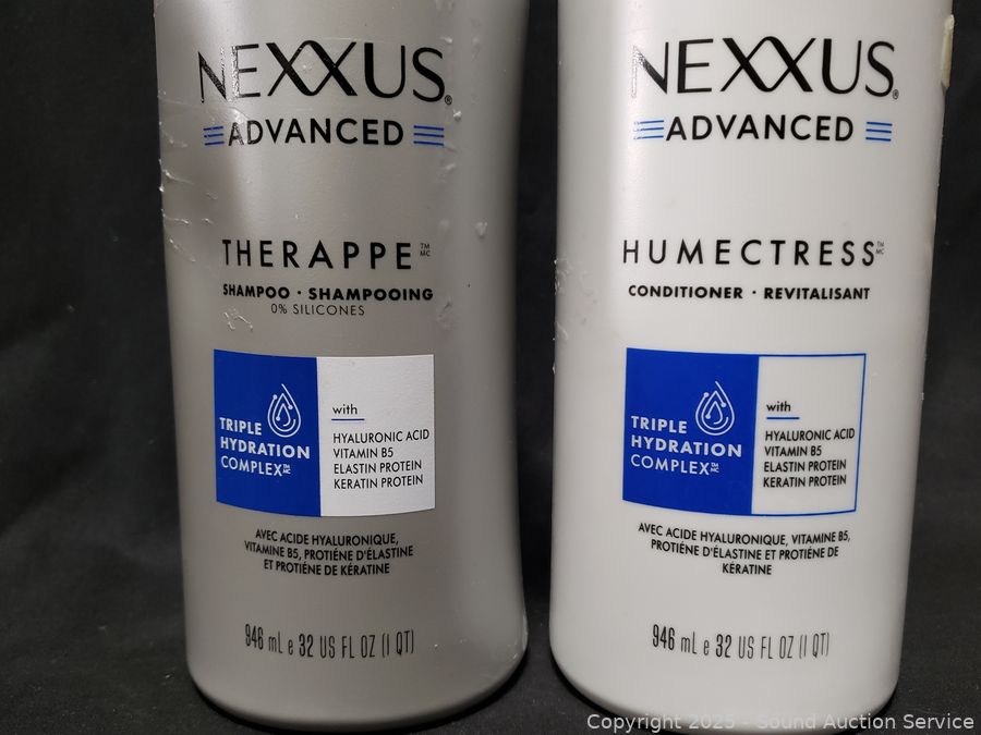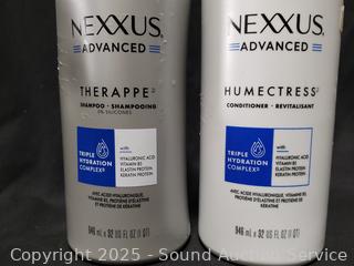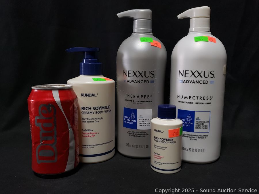 Nexxus Humectress Conditioner, Therappe Shampoo 32oz bottles, 3/4 full. Kundal Rich Soymilk Creamy Body Wash 16.9oz & 3.38oz bottle, feel full.