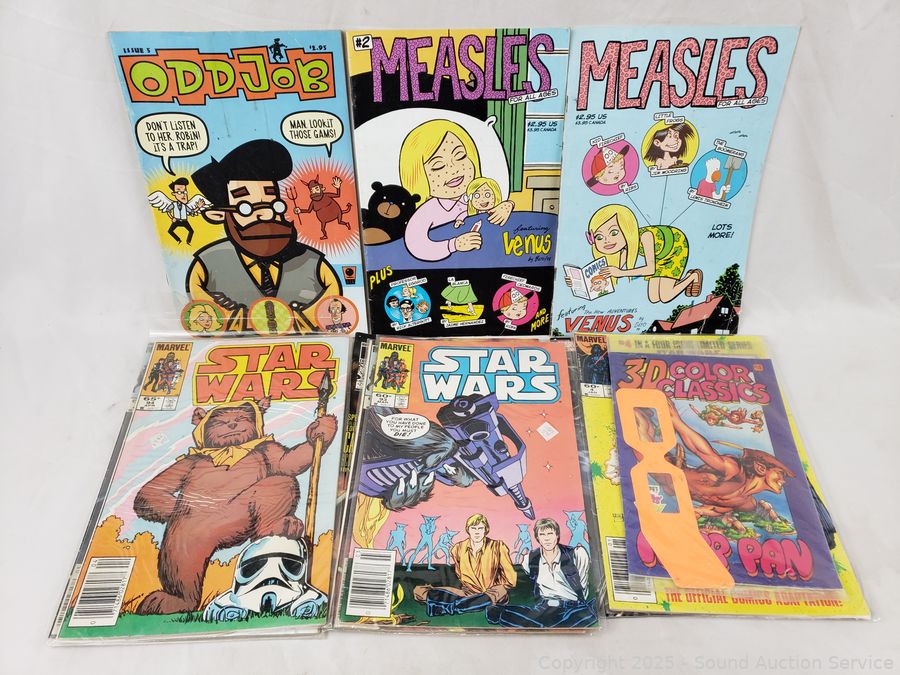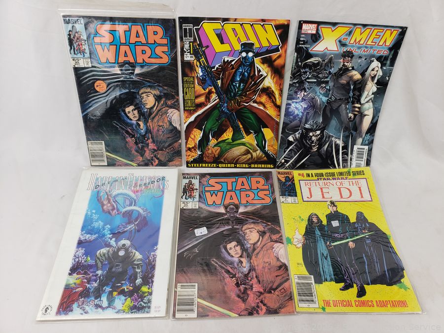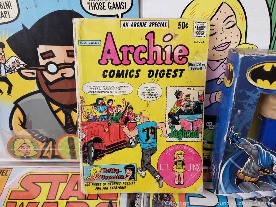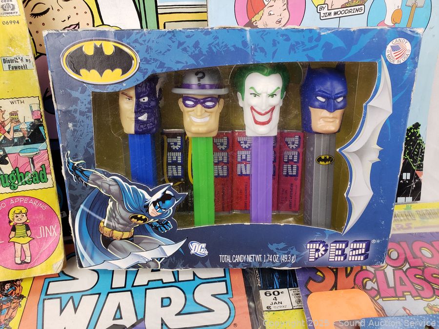 Batman Pez Dispenser collectors set, appears sealed, some wear to package, 3 batman Justice League figures, assorted comics, Archie, Star Wars, Cain, etc. Refer to photos for lot contents, more details.
