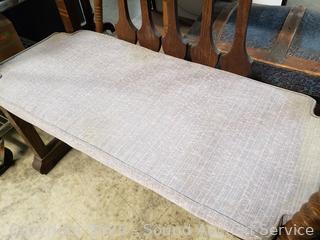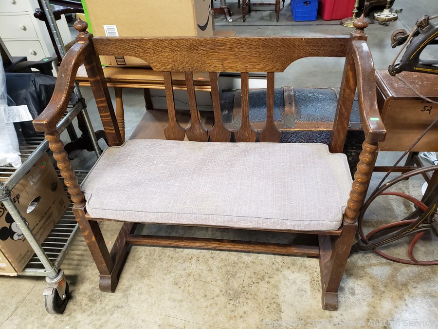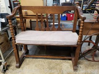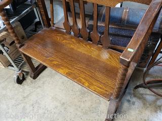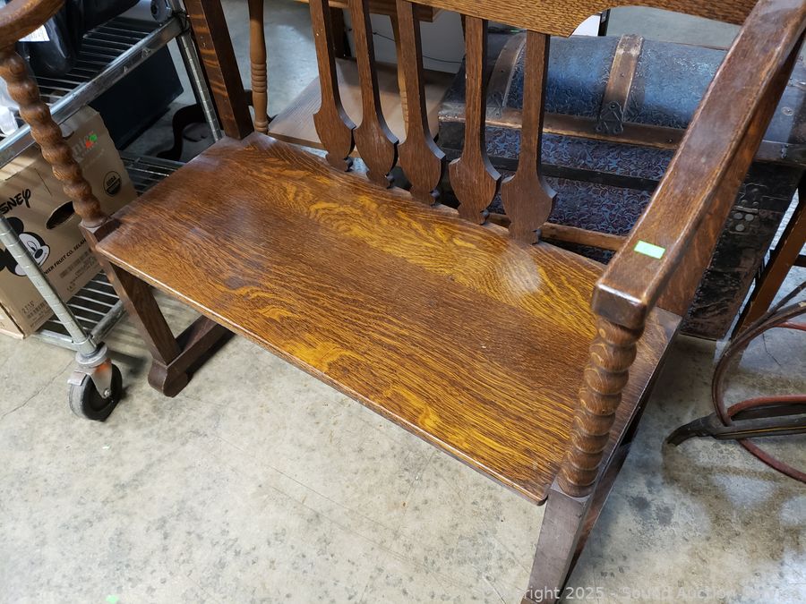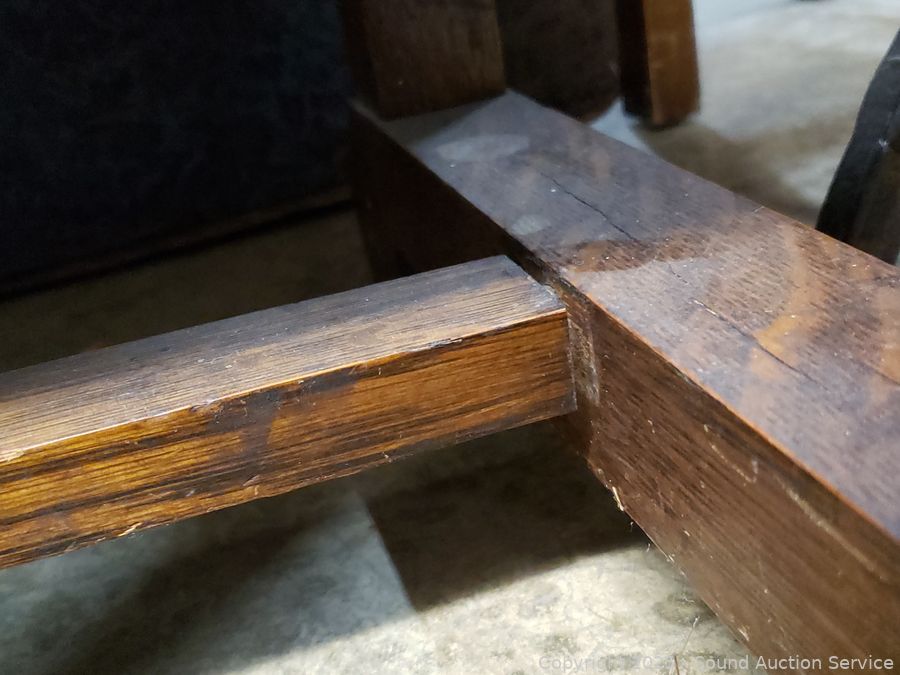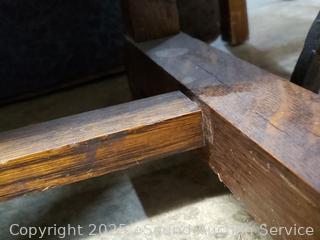 A bit loose, wobbly. 38" H x 37" W x 16" D. Olde patina finish, wear from use.