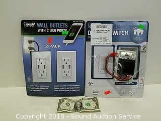 Lot #0094: 2-Pack USB Wall Outlets & Slide Dimmer Switches