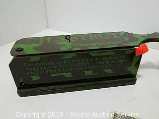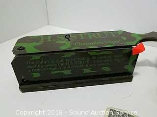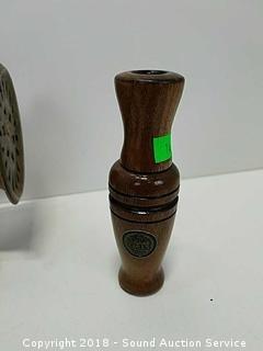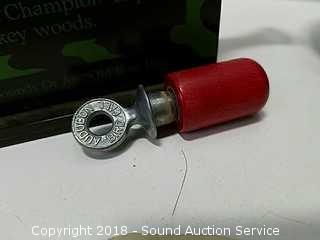 Includes: antique brass car horn, crow call, wooden game call, and H.S. Strut "Champion Yelper".