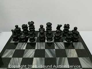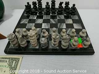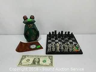 Lot #0189: Stone Chess Set, Desk Clock & Frog Fairy Light