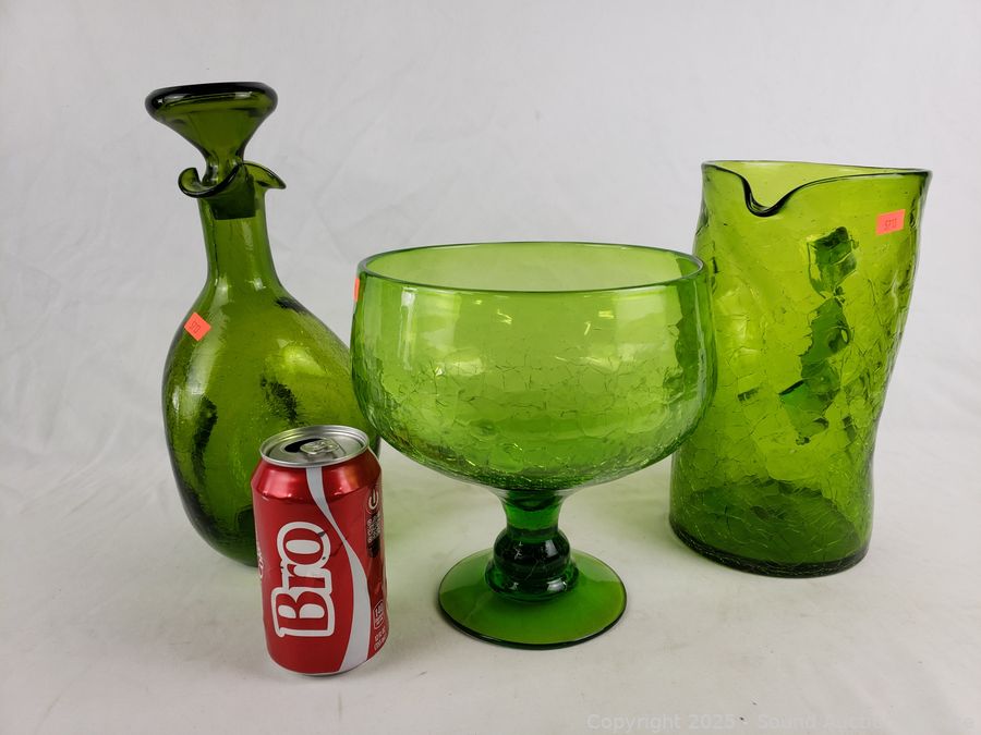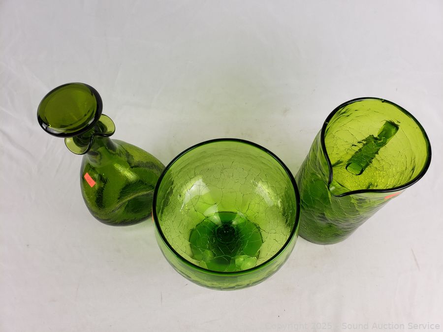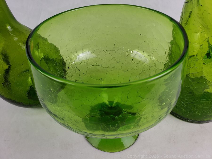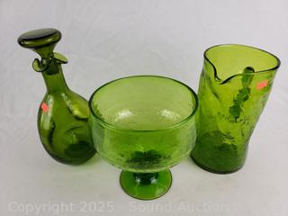 Lot #0192: 3pc Green Crackle Glass Compote, Decanter, Pitcher