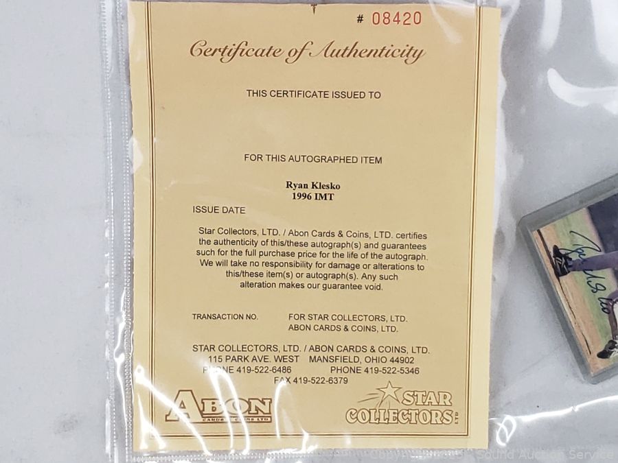 1996 Ryan Klesko Autographed Card w/COA. Refer to photos for lot contents, more details.
