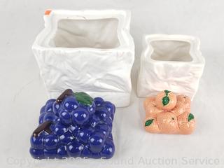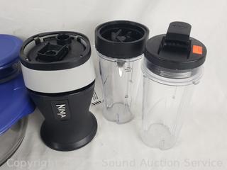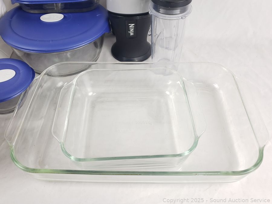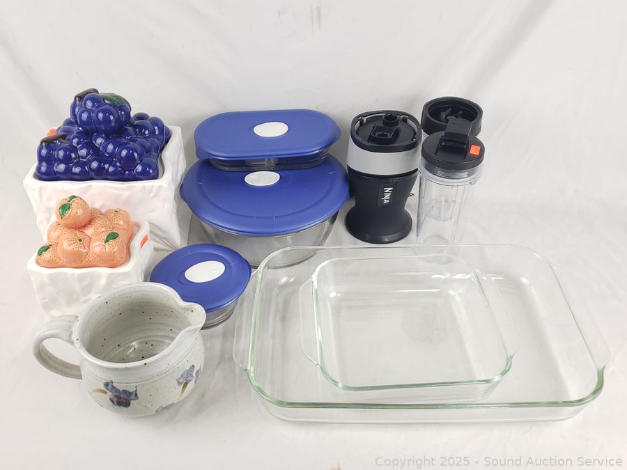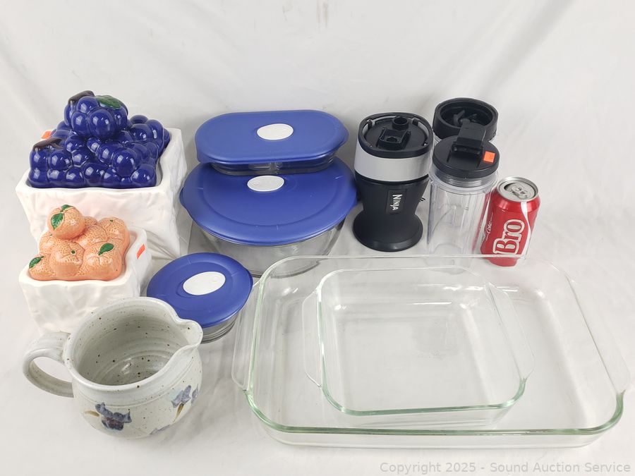 Cookie jar, pottery pitcher, blender bottle, travel bottle, glass cookware. Refer to photos for lot contents, more details.