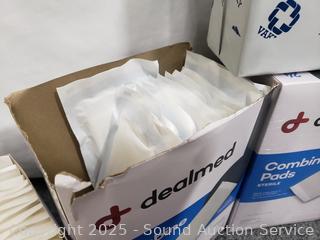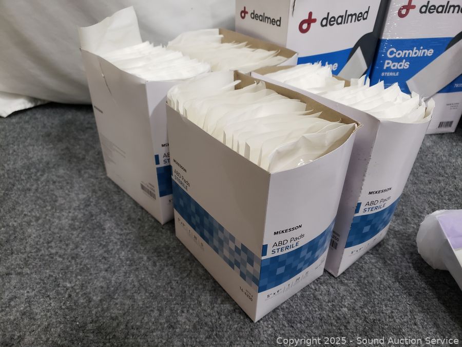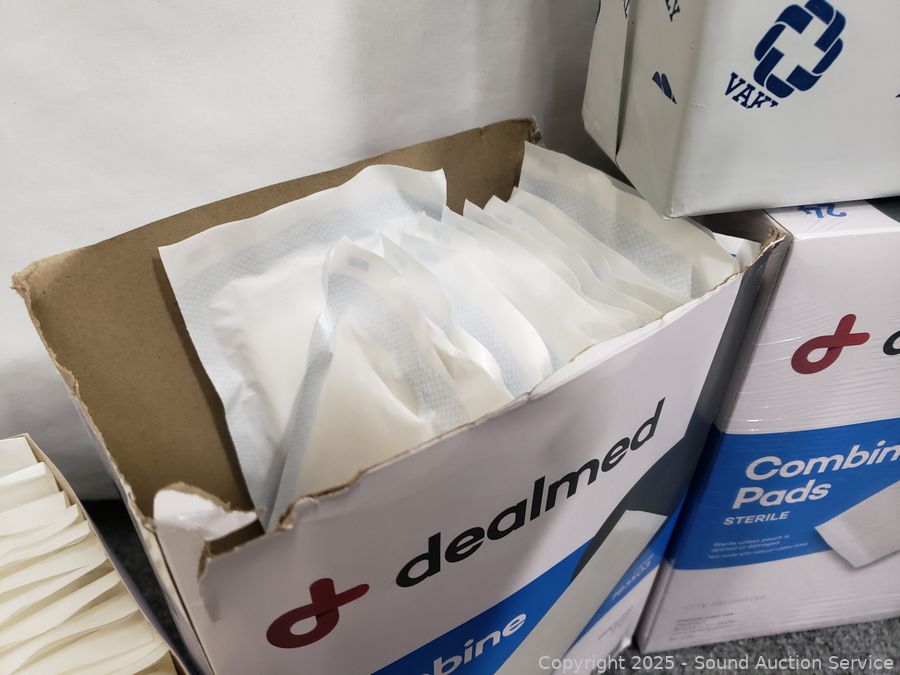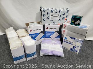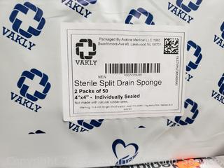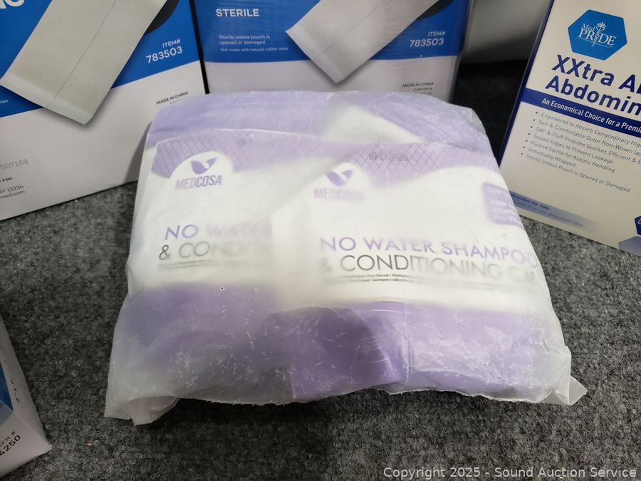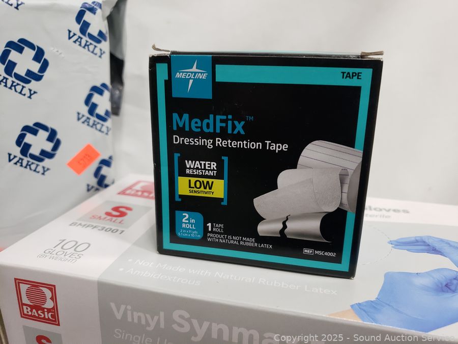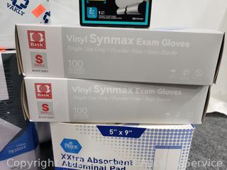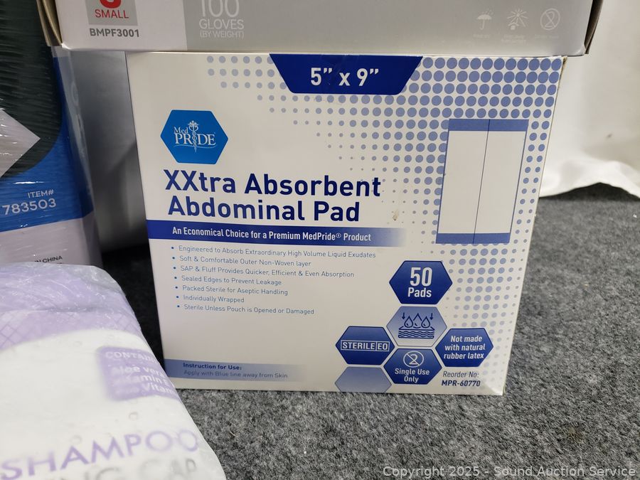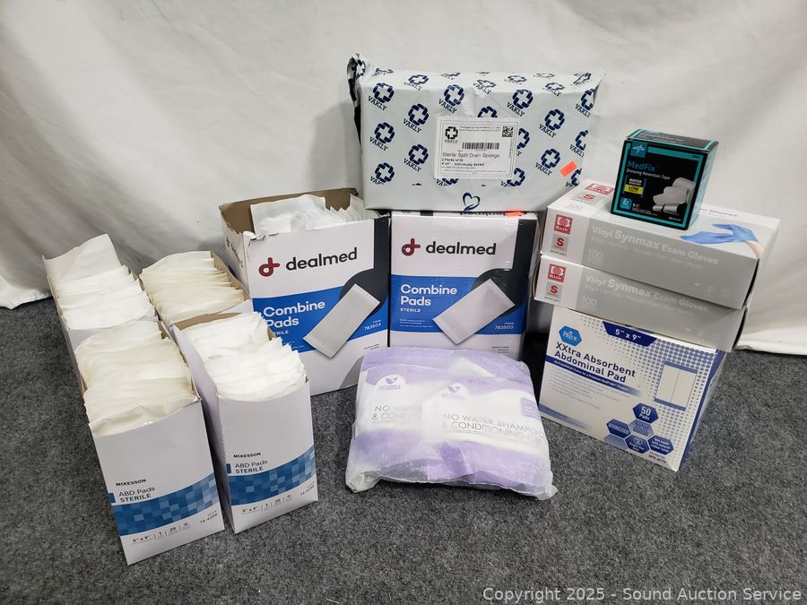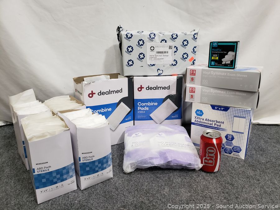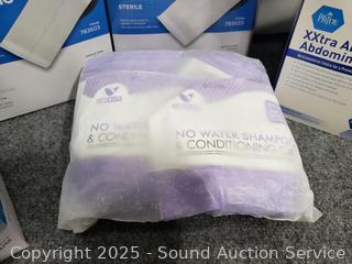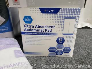 (2) 100pk Vinyl Exam Gloves, ABD Sterile Pads, No Water Shampoo & Conditioners, 8x10 Sterile Pads, Sterile Split Drain Sponge, Dressing Retention Tape, 5x9" Xtra Absorbent Abdominal Pads. Refer to photos for lot contents, more details.