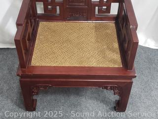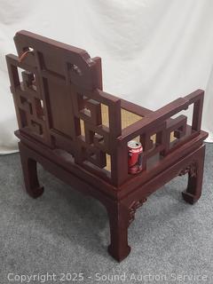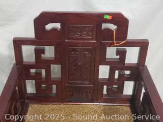 Carved scene in the back splat, scrolled design. 36" H x 27.5" W x 23.5" D x 16" to seat. Some light wear to finish. Matches the previous lot.