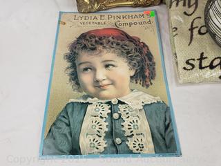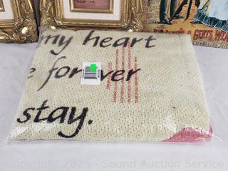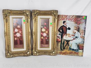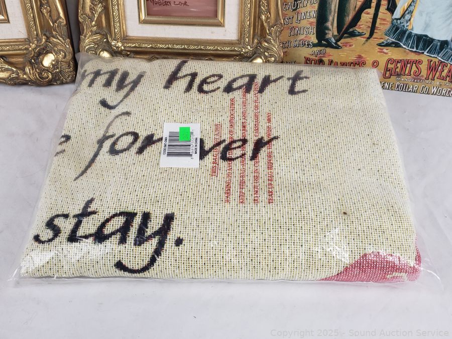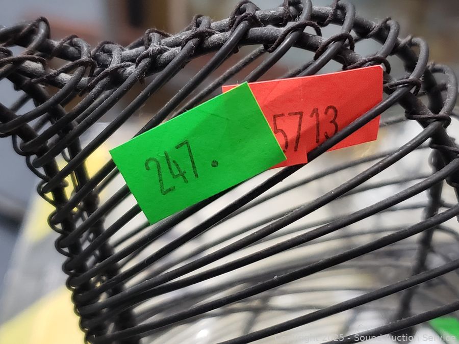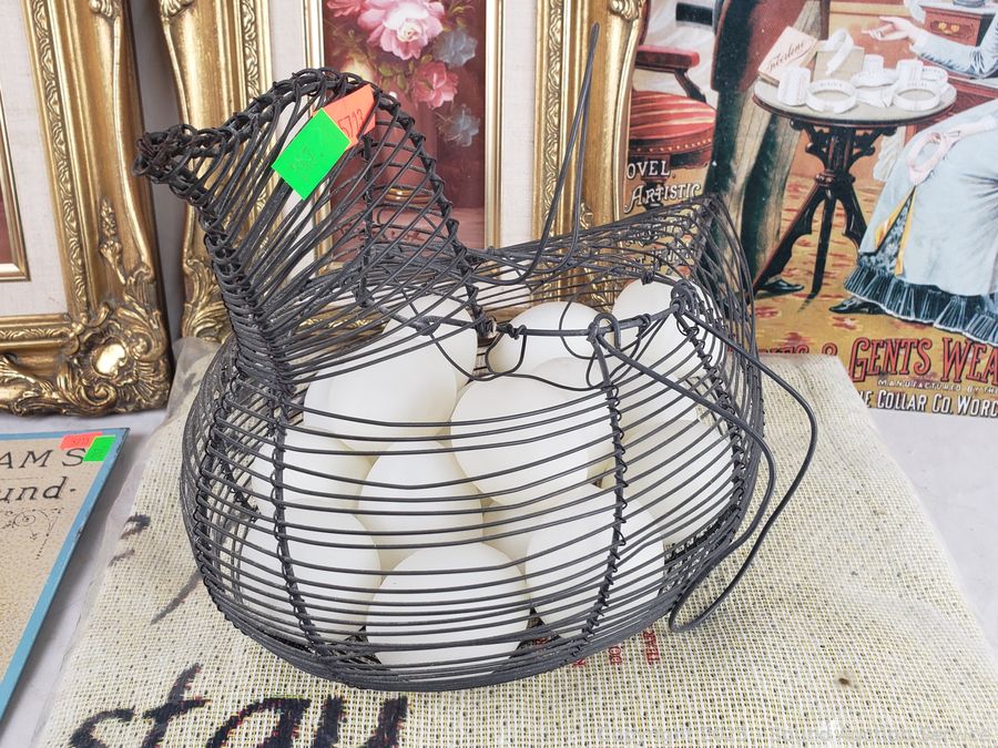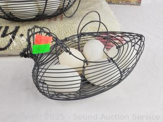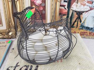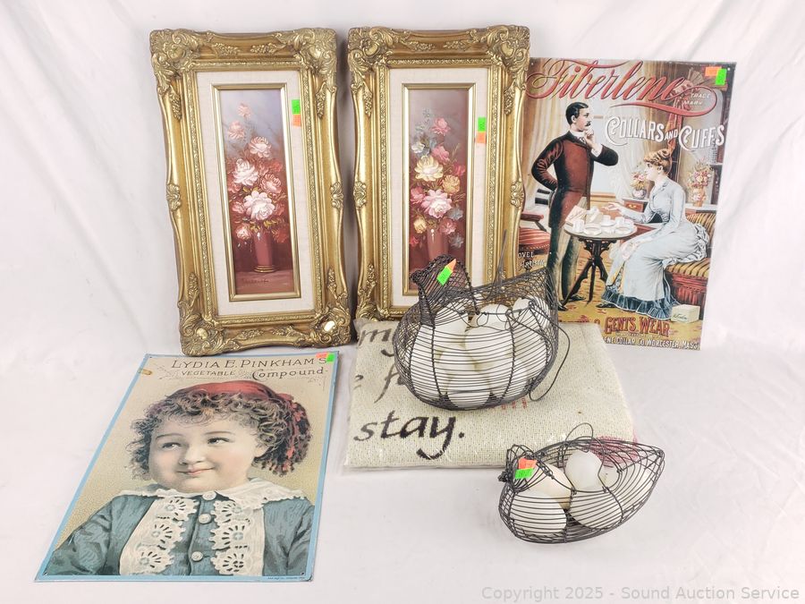 Lot #0247: Throw Blanket, Wire Egg Baskets, Floral Paintings, Tin Signs