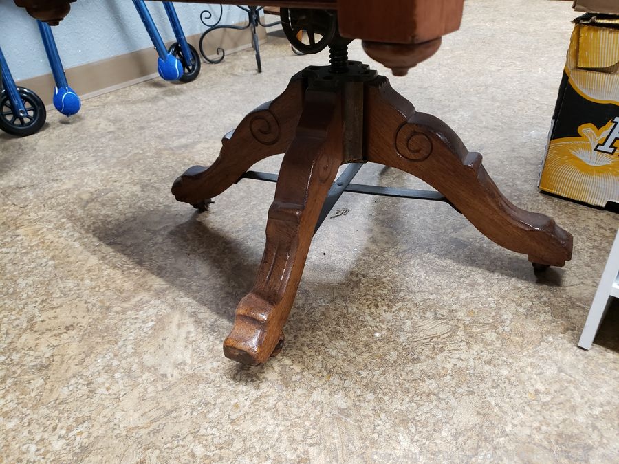 Swivel height adjustment. 39" H x 22" W x 19" to seat. Olde patina, some wear to finish.