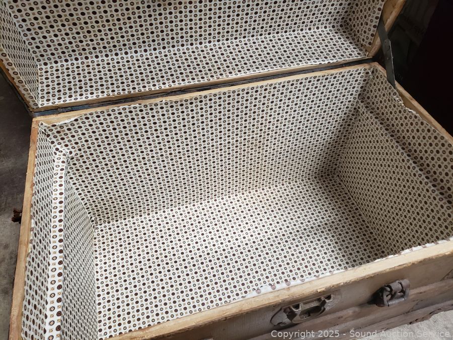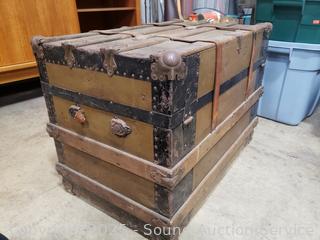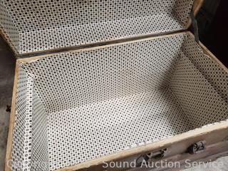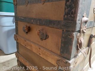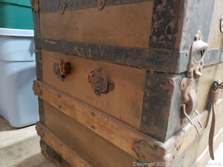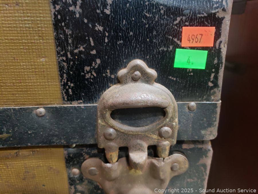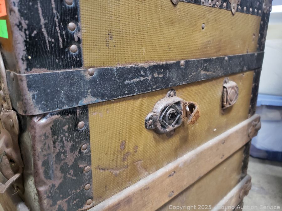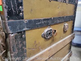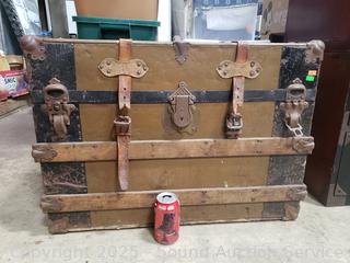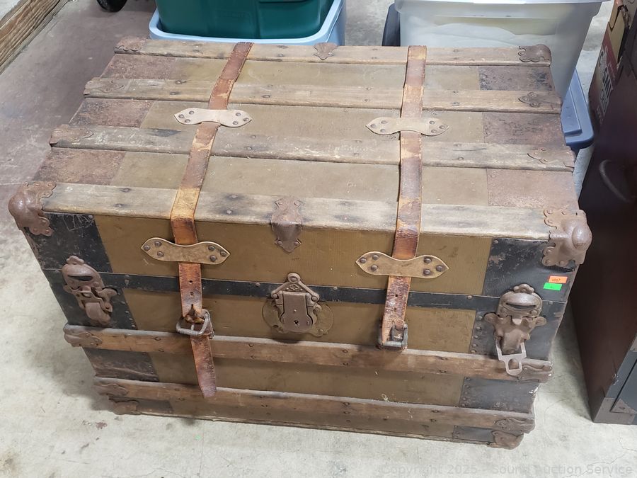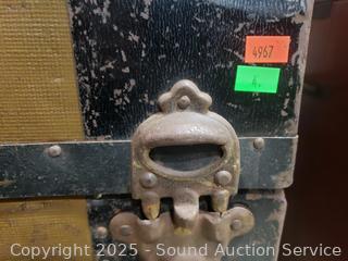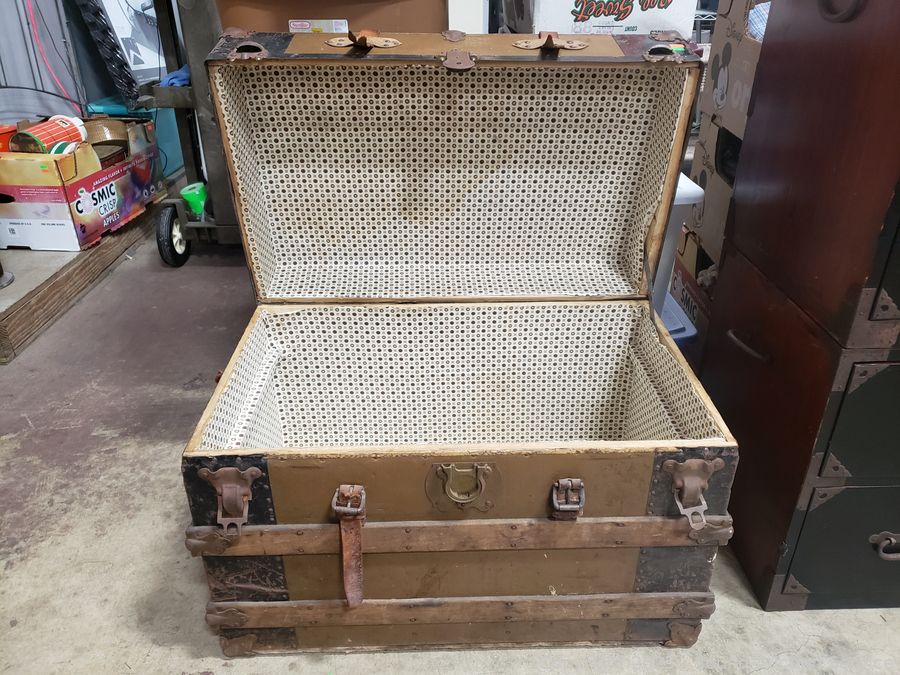Various rust, wear to finish. Leather straps (damaged, broken), bent hinge for one latch, broken/missing leather handles. 20" H x 28" W x 17" D.