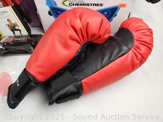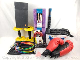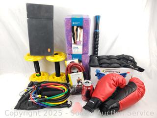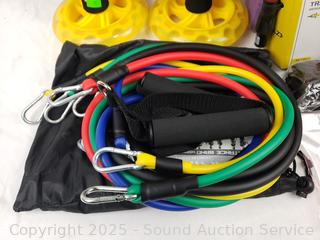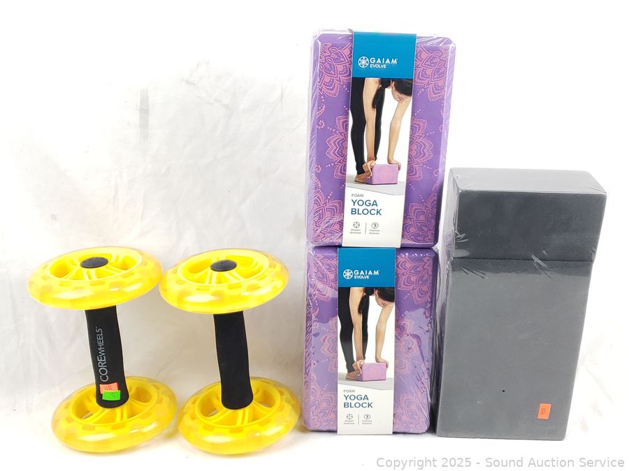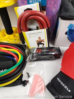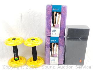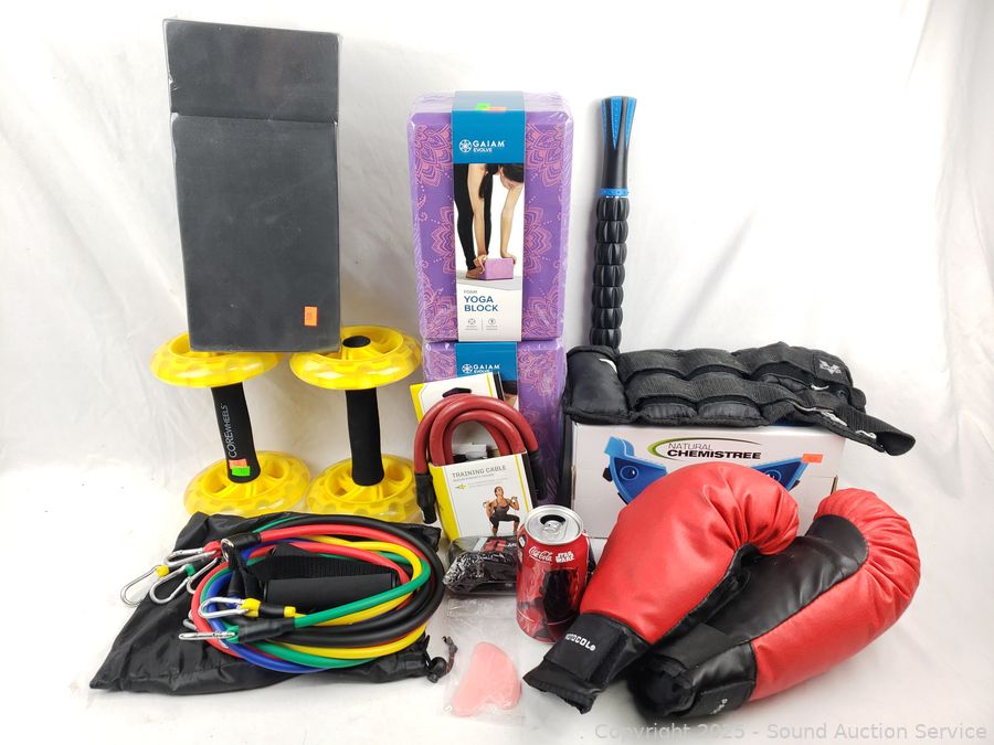 2 Core Wheels, Protocol Punching Gloves, resistant bands, foot rocker, training cable, Yoga blocks, etc. Refer to photos for lot contents, more details.