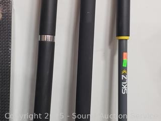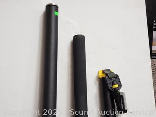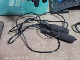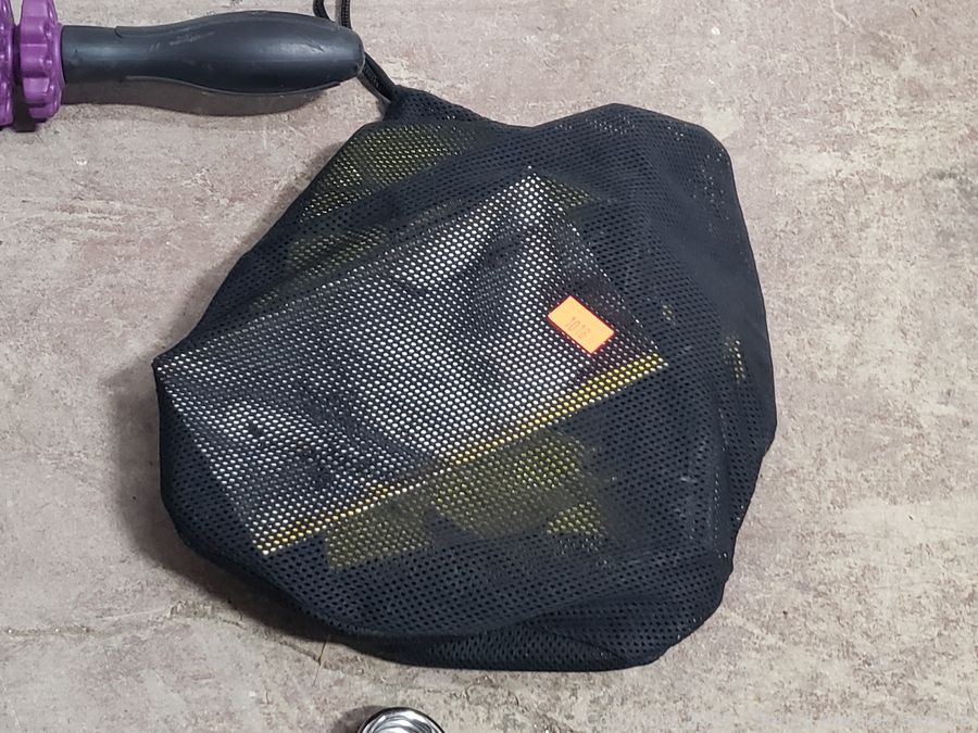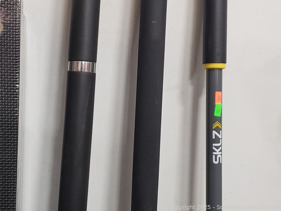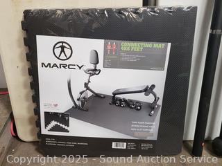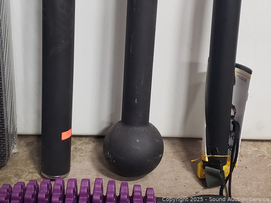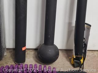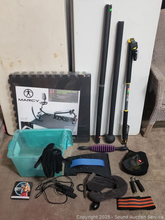 Marcy Foam 4ft x 6ft interlocking mat set ((6) 24" x 24" interlocking mats with 12 borders, factory sealed), 3 weighted bars, grip strength trainer, massage roller, jump rope, etc. Refer to photos for lot contents, more details.