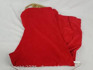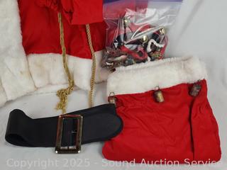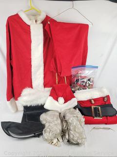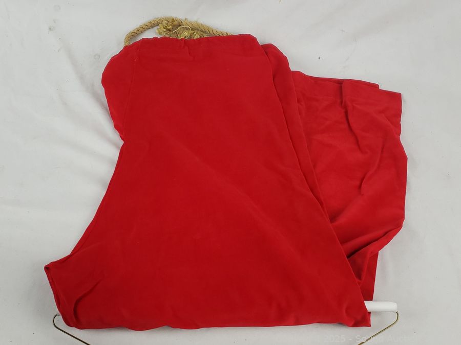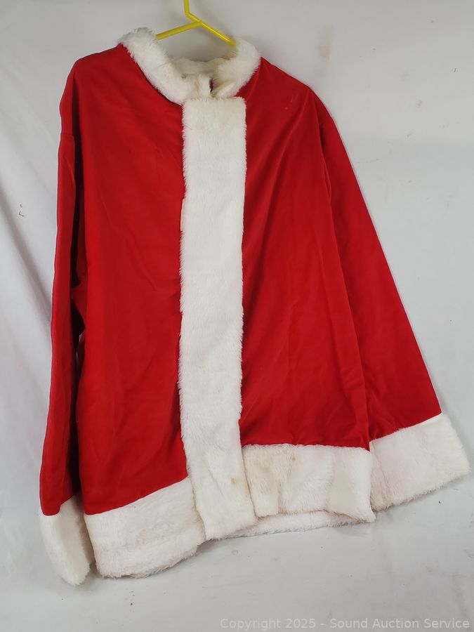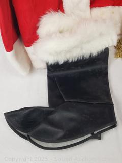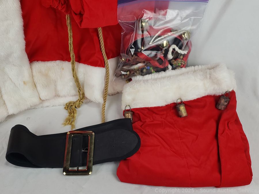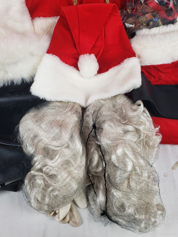 Some staining. Coat, pants, beard, wig, glasses, gloves, boots, belt, gift bag, bells.