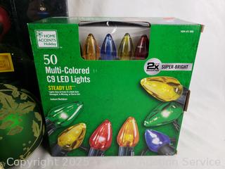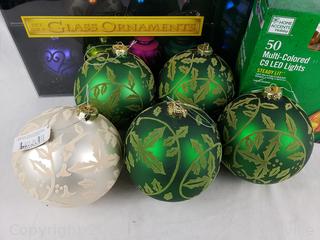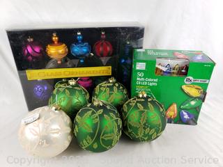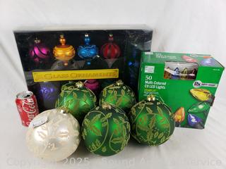 Lot #0161: 14 Glass Ornaments & Set 5 Multi-Colored String Lights