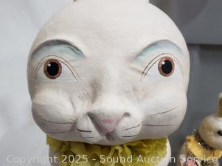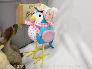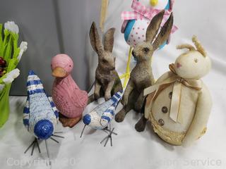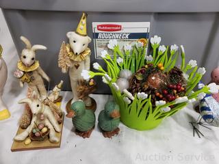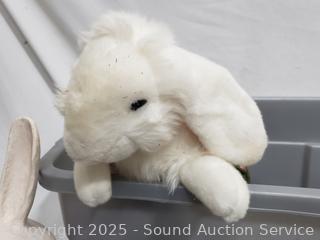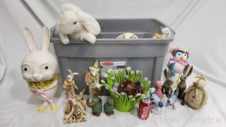 Assorted bunny figures, decor. Totes with lids included 16.5" H x 30" x 18.5" & 10.5" x 15" x 10.5".