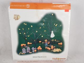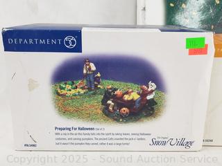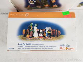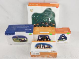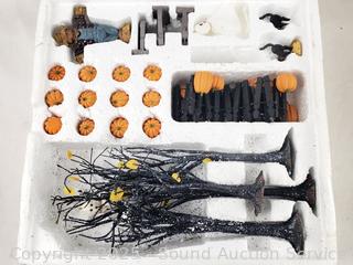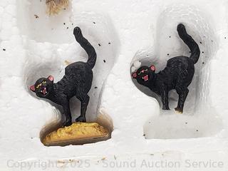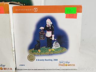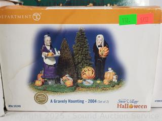 2 "A Gravely Haunting", 2004 & 2008", 3pc "Treats for Kids", 24pc "Halloween Village" (possibly missing the leaf pile, comes with extra ghost pumpkin, one cat is missing the base), 2pc "Preparing for Halloween". All with original boxes.