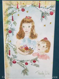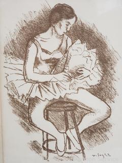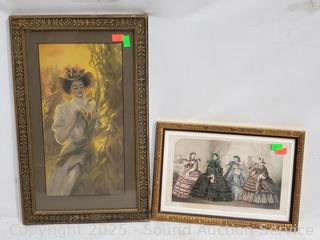 2 Hand tinted Victorian etching, 14" x 12", 7.5" x 10.75". Moses Soyer "Seated Ballerina" Lithograph, 12" x 15". Alfred James Dewey Lady Print, 15" x 9.5". Original Paula D's '09 watercolor, 17" x 13".