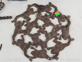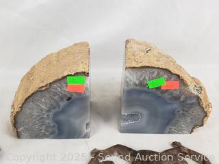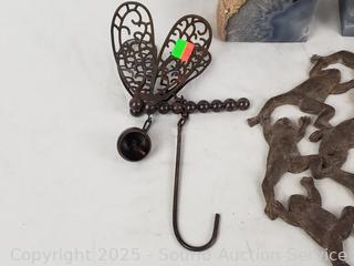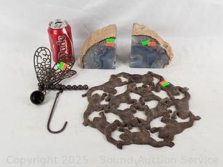 Lot #0185: Quartz Stone Bookends, Cast Iron Frog Trivet, Dragonfly Bell Hanger