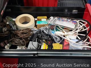 Ball bearing drawer guides. Some hardware in a couple drawers. Locking, with keys & 2 replacement locks not installed. Various wear from use. 35" H x 48" L x 25" W.