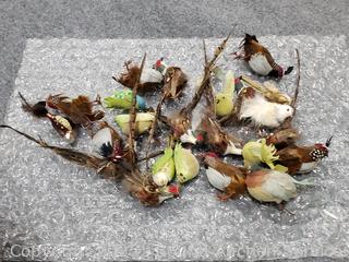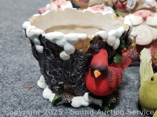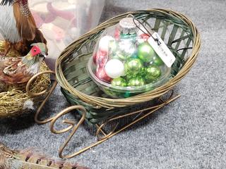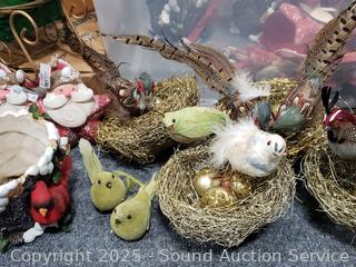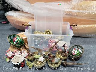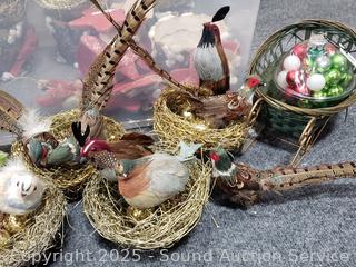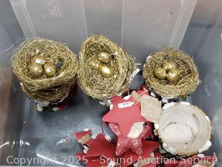 Ornaments, real feather bird w/nests, eggs, sleds, etc. Tote with lid included, 13" H x 15.5" x 23".