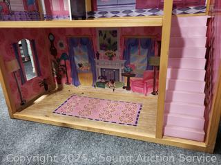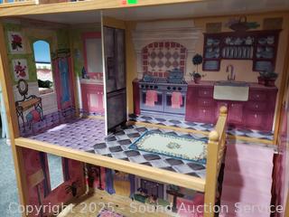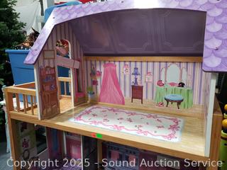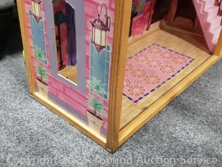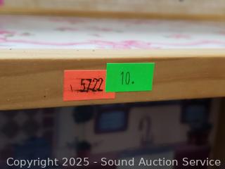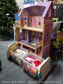 Lot #0010: Wood Framed Doll House w/2 Totes of Accessories