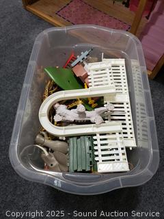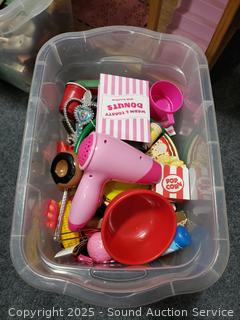45" H x 28.75" W x 11.75" D. 2 Small totes loaded with doll, playset accessories. Christmas is coming, make a great gift for a little girl! Refer to photos for lot contents, more details.