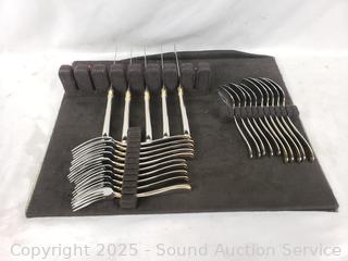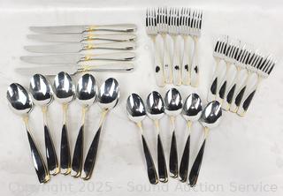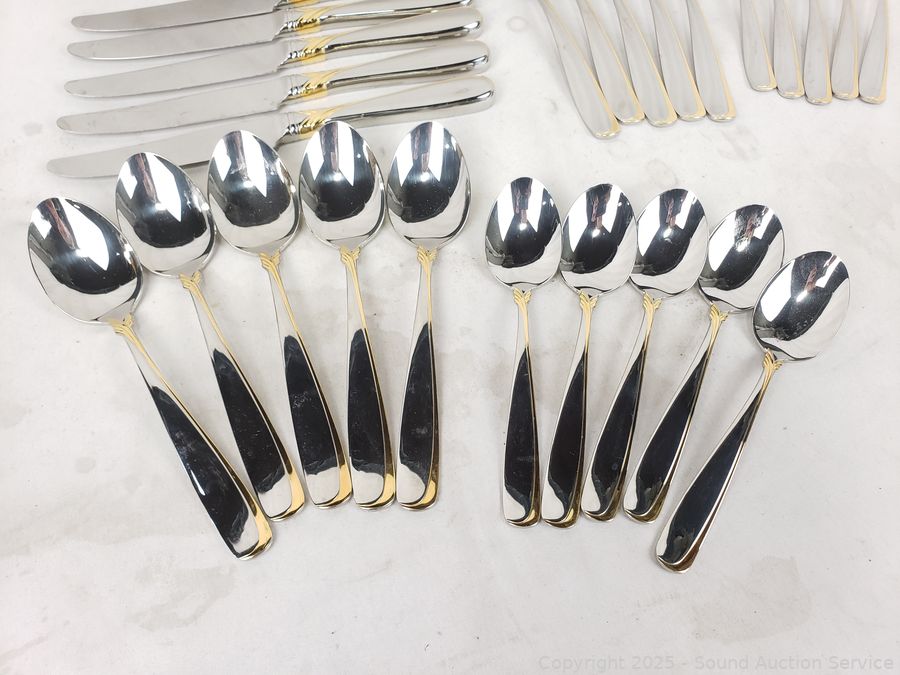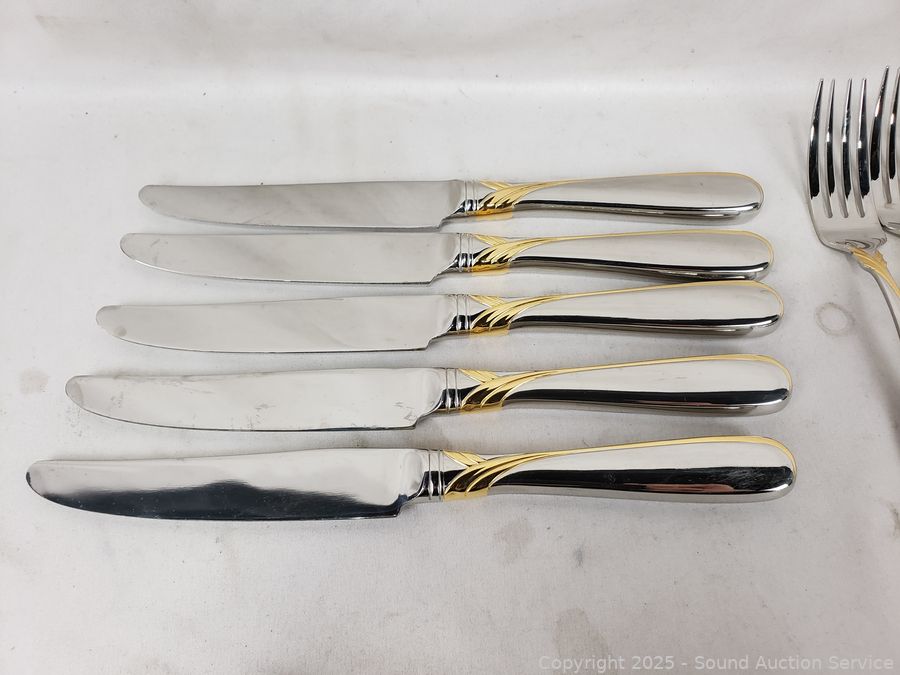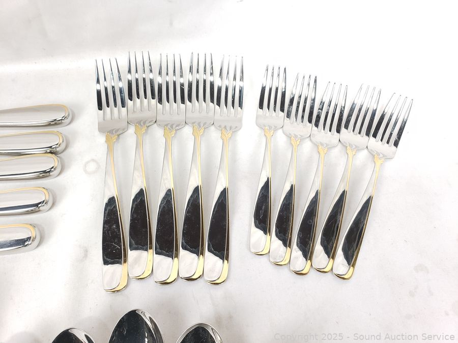 Lot #0268: 25pc Yamazaki Japan Stainless Gold Accent Flatware Set w/Tray