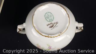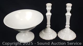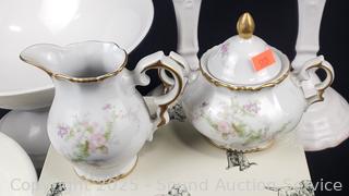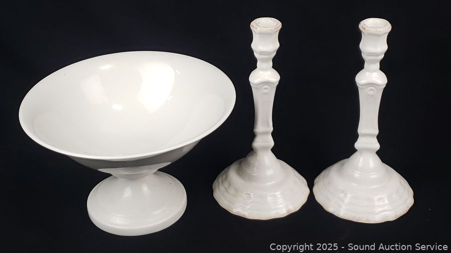 Cream, sugar, candleholders, bowls, vase, votives, etc. Refer to photos for lot contents, more details.