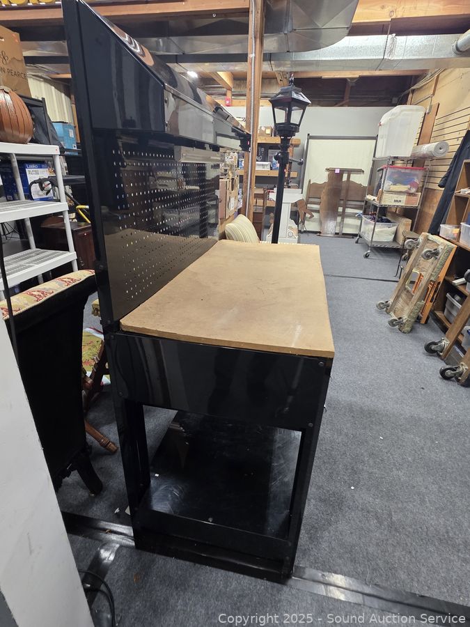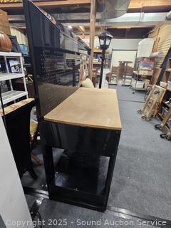 3 drawers, holes for peg hooks, light (no cord), ball bearing drawer guides, power strip mounted to the side. Particleboard top is warped. Top right drawer hits lower drawer when pulled out. 37" H to bench, 62.5" H x 45" W x 24" D overall.
