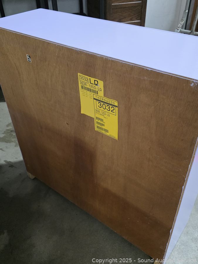 Appears to be solid wood construction. Don't see any major issues. 36" H x 36" W x 12.5" D.