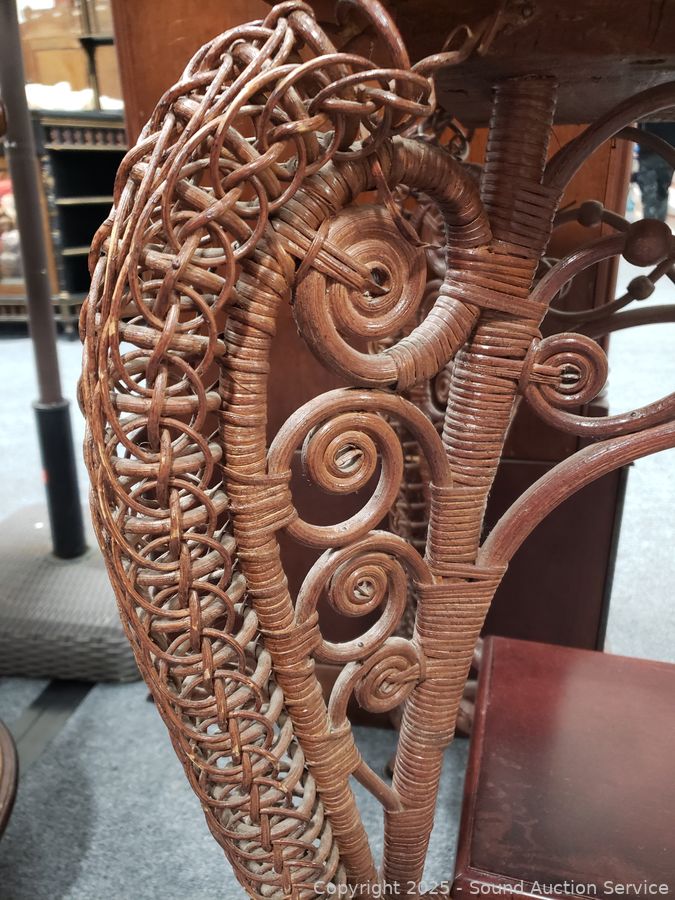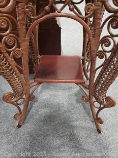30" H x 20" x 20" overall. Some scuffs, scratches in finish. See a couple loose pieces of wicker.