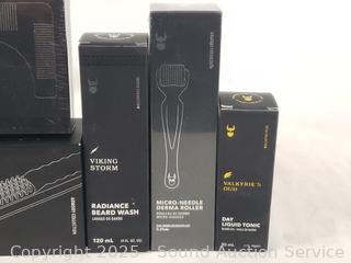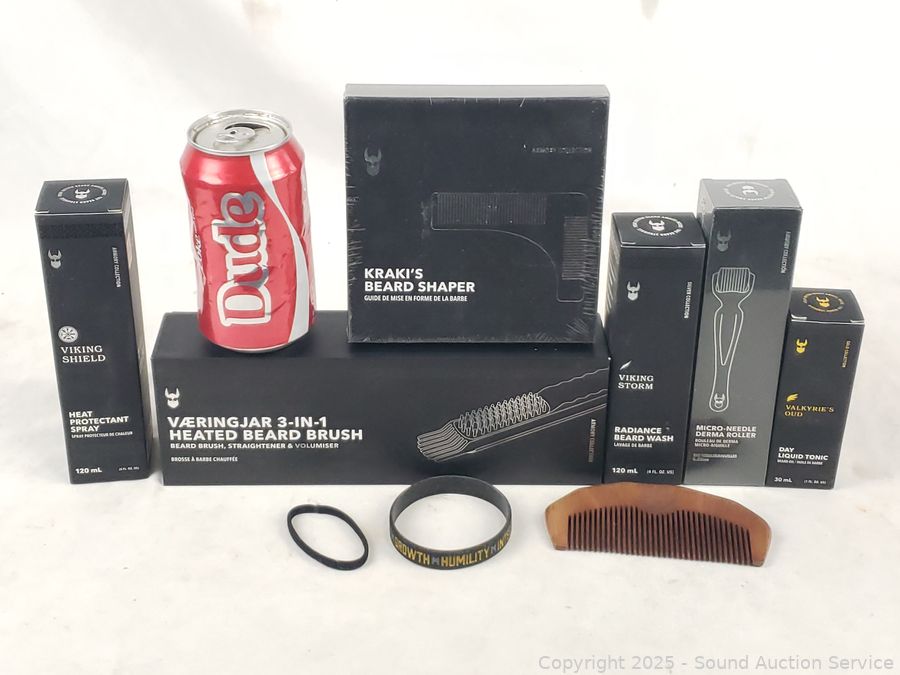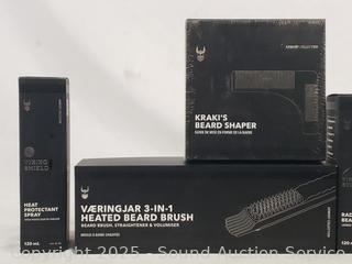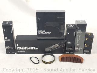 Heated beard brush, beard shaper brush, beard comb, beard wash, day liquid tonic, micro-needle derma roller, heat protectant spray. Some items are sealed, bottles feel full.