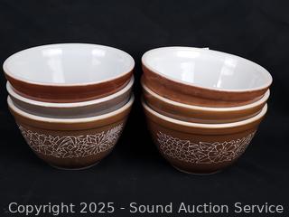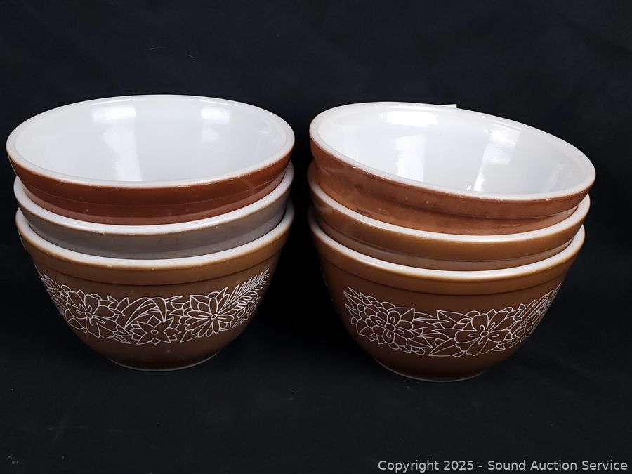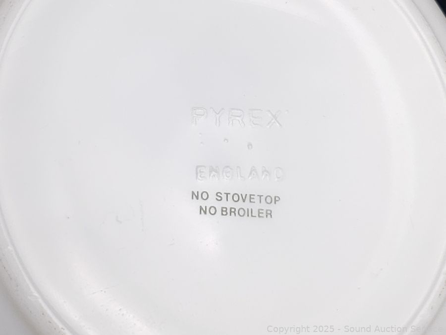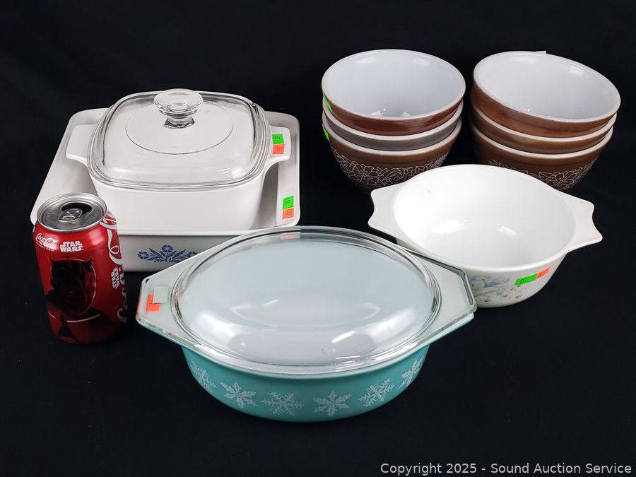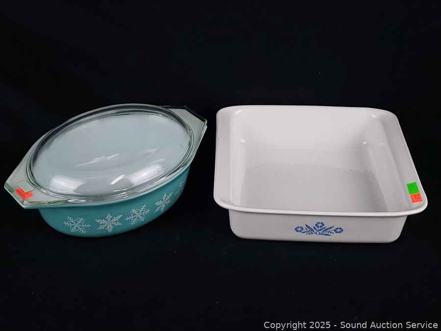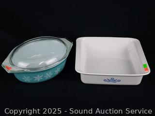 Turquoise snowflake 8" baker w/lid (chip on lid), Pyrex "Blue Iris" bowl, 6 Pyrex Woodland 5.75" bowls, Corning 7" baker w/lid, 8" x 9" x 2.5" baker. Refer to photos for lot content, more details.