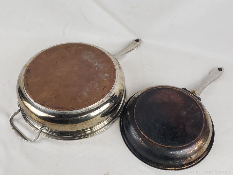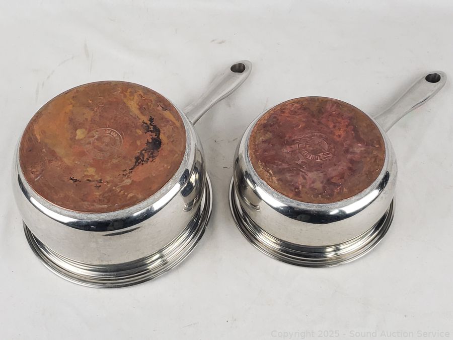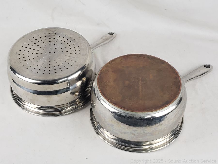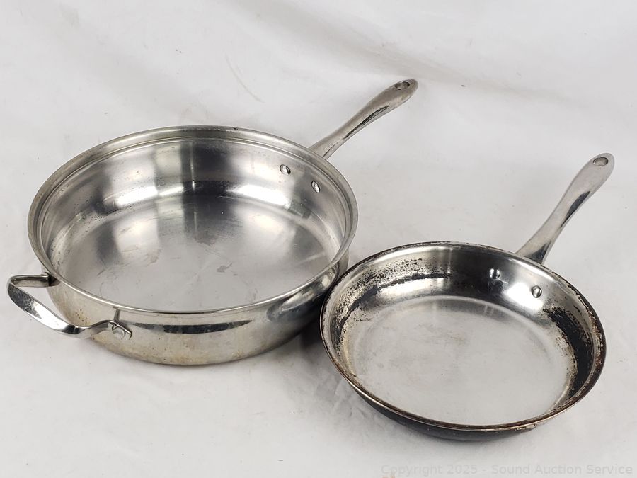 Signs of wear from use, 10" skillet have wear from use. 3.5qt double boiler saucepan, 1qt & 2qt saucepans, 12.5" frypan.