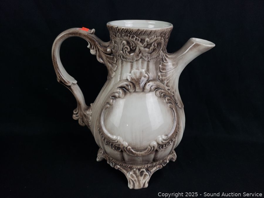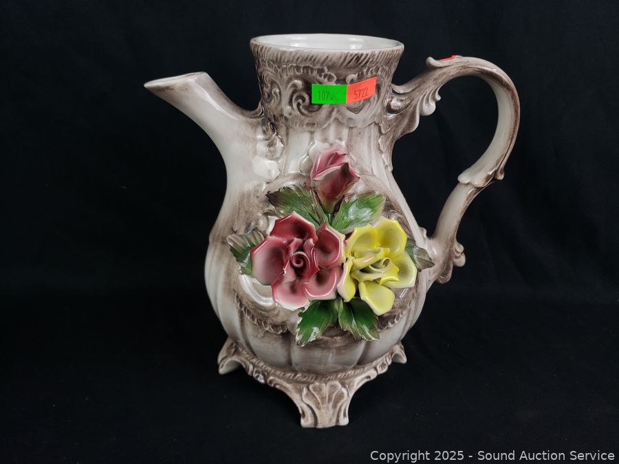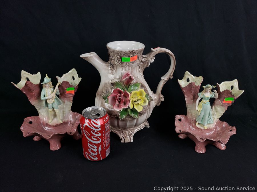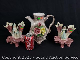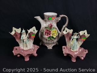 Lot #0107: Antique Pottery Pitcher & Victorian Vase/Dishes