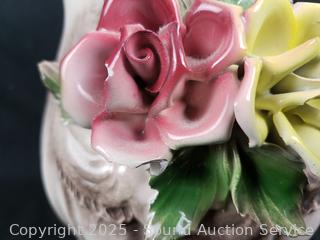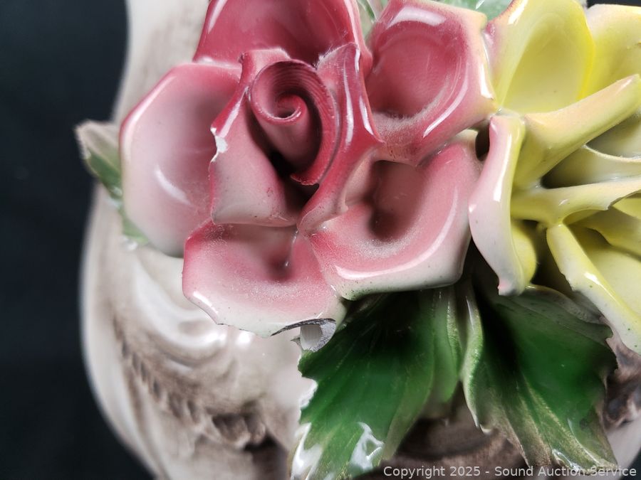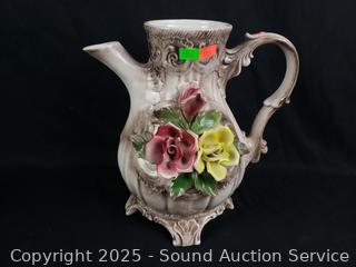 6.5" to 8.5" tall. various chips on flower accent on pitcher, stamped Capodimonte Italy on the bottom.