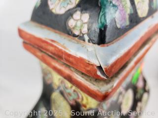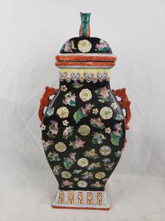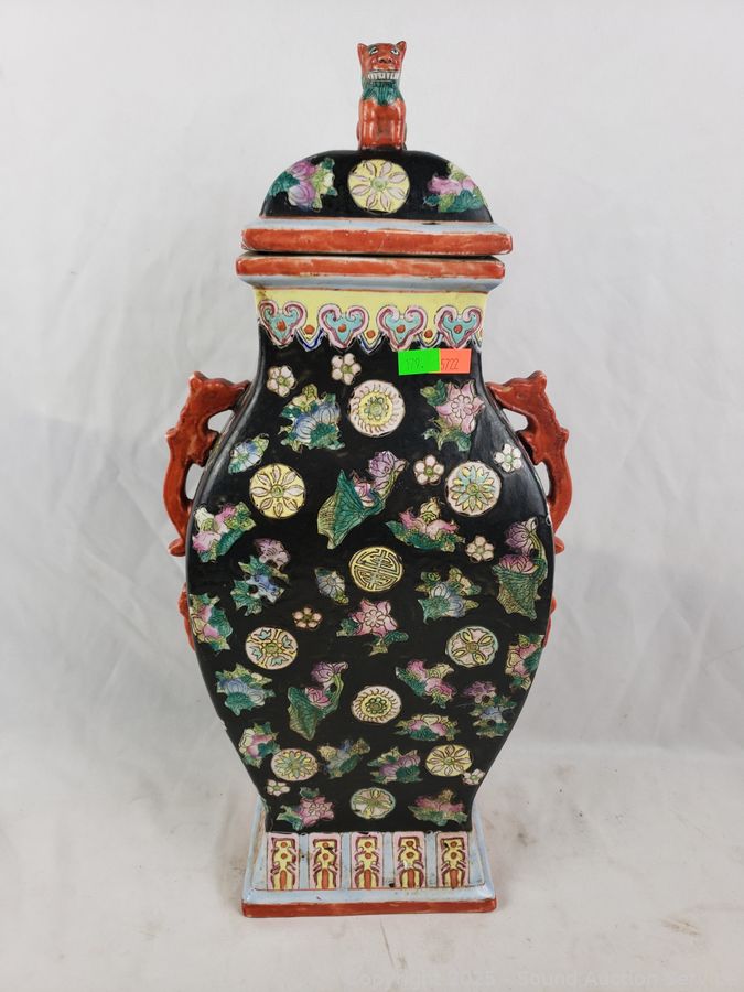 Stamped Chinese mark on the bottom of the urn, lid has some cracks, 19" tall. Lion is missing an eye, 11" H x 14.5" L x 6".