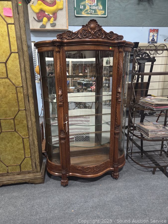 Lot #0001: Vintage Oak R.J.Horner & Co. Ornate Mirrored 4-Shelf Curio Cabinet