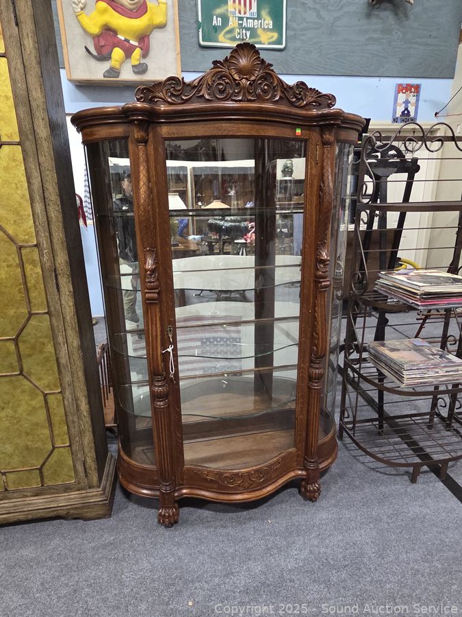 Serpentine front & glass, carved claw feet, carved accents, skeleton key lock w/key. 72.5" H x 45.5" W x 19" D. Some minor scuffs, mainly on the feet, overall great condition. R.J.Horner & Co. Furniture makers NY.