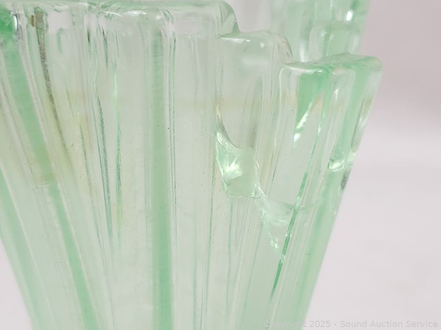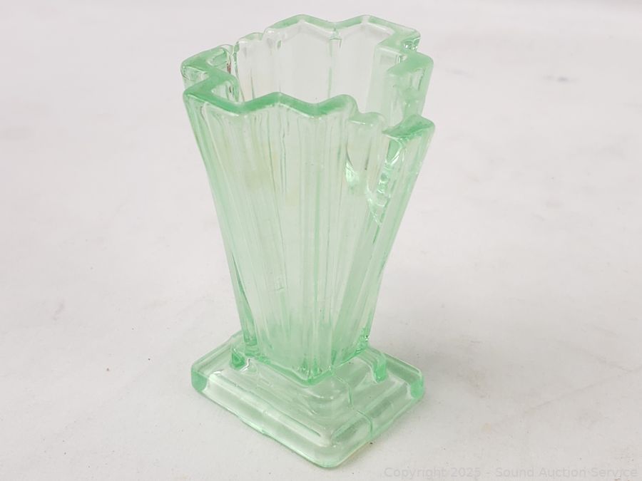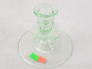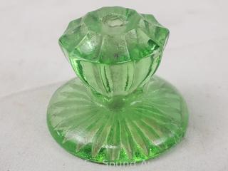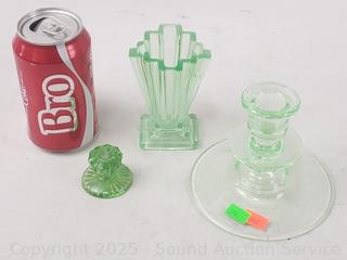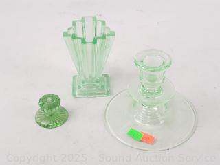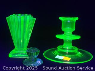 Lot #0244: 3pc Uranium Glassware Vase, Pull, Candleholder