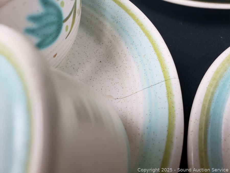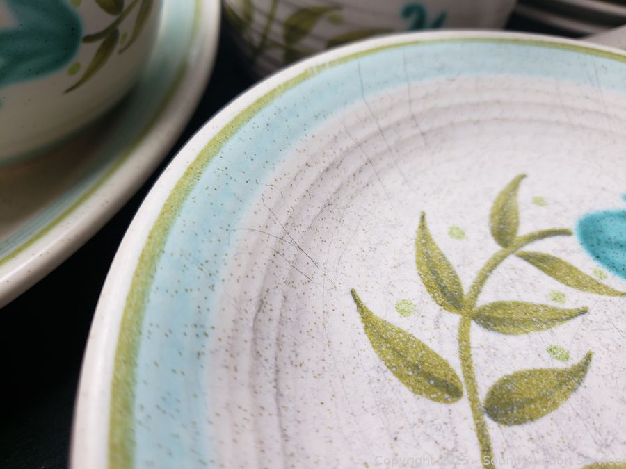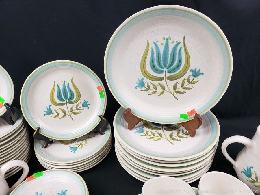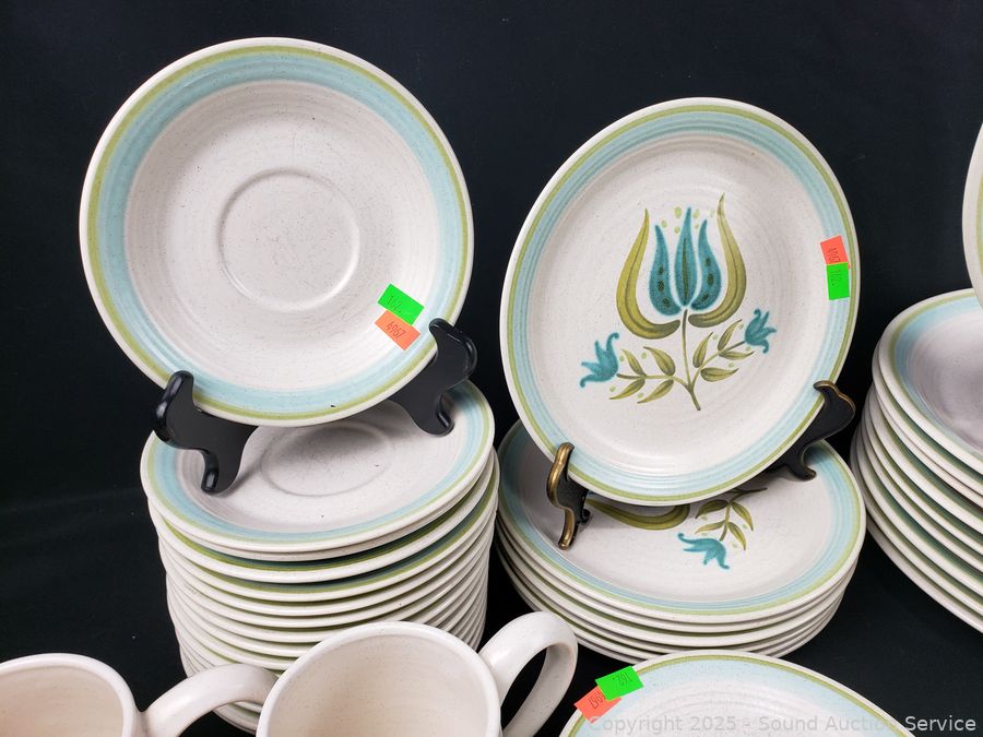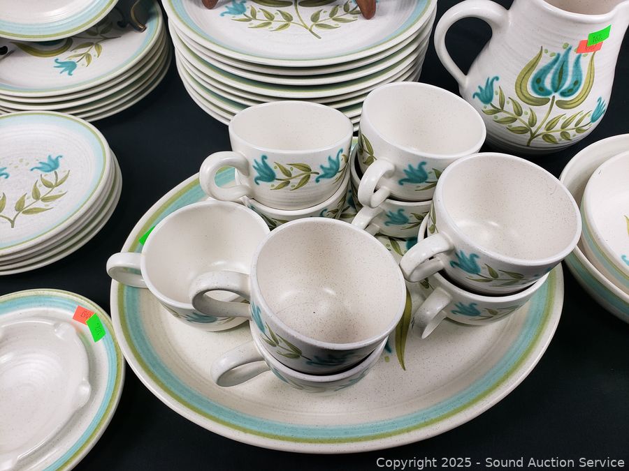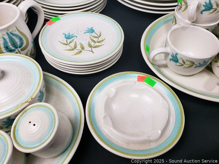 2 mugs, 3pc salt/pepper, cream/sugar, 9 teacups, pitcher, 6.5" & 7.5" bowl, 10 dinner plates, 16 saucers, ashtray, 5 snack plates, 7 salad plates, 11" & 13" platter. See a few chips, cracks, wear from age/use.