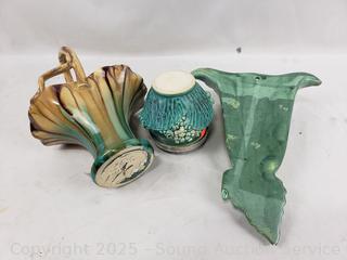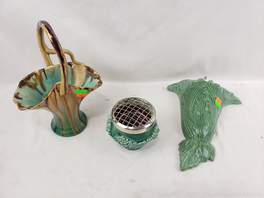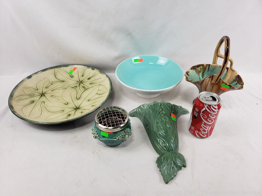 Handled basket, flowerpot, wall pocket, Royal Haeger, 12.75" charger. Don't see any major issues.